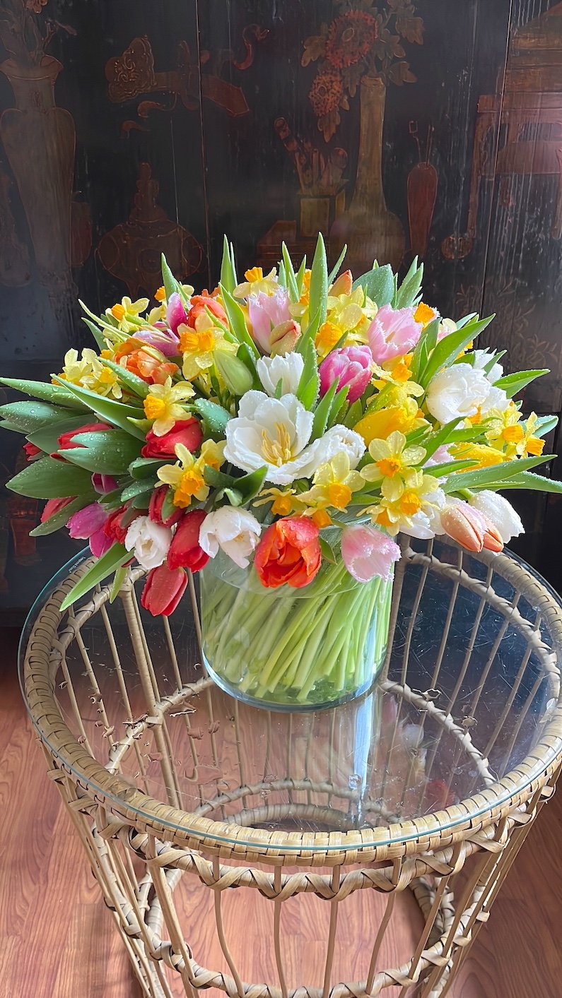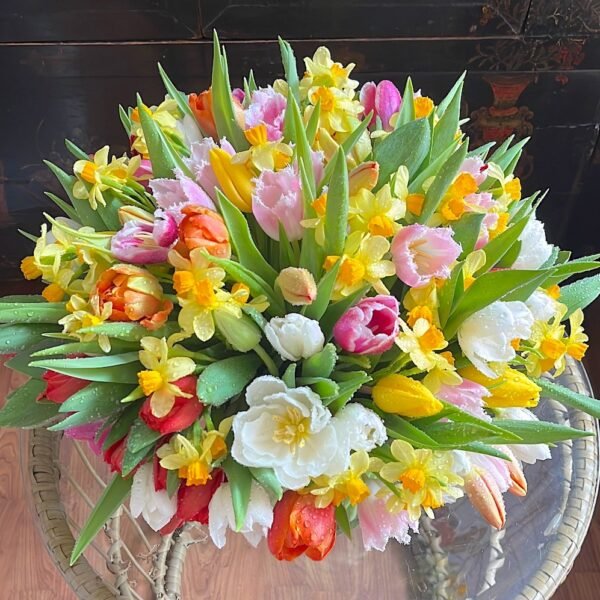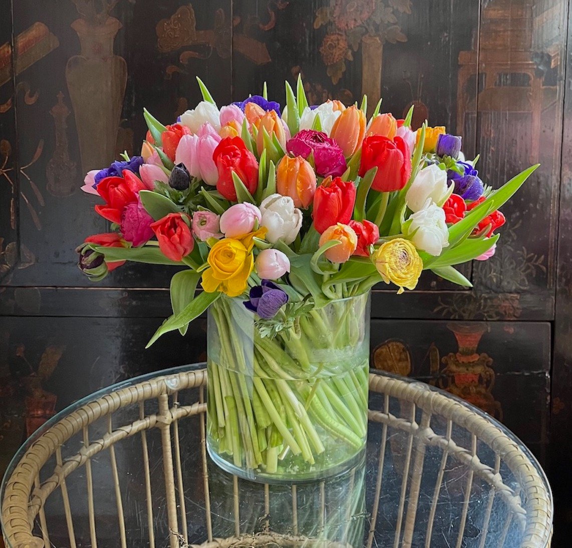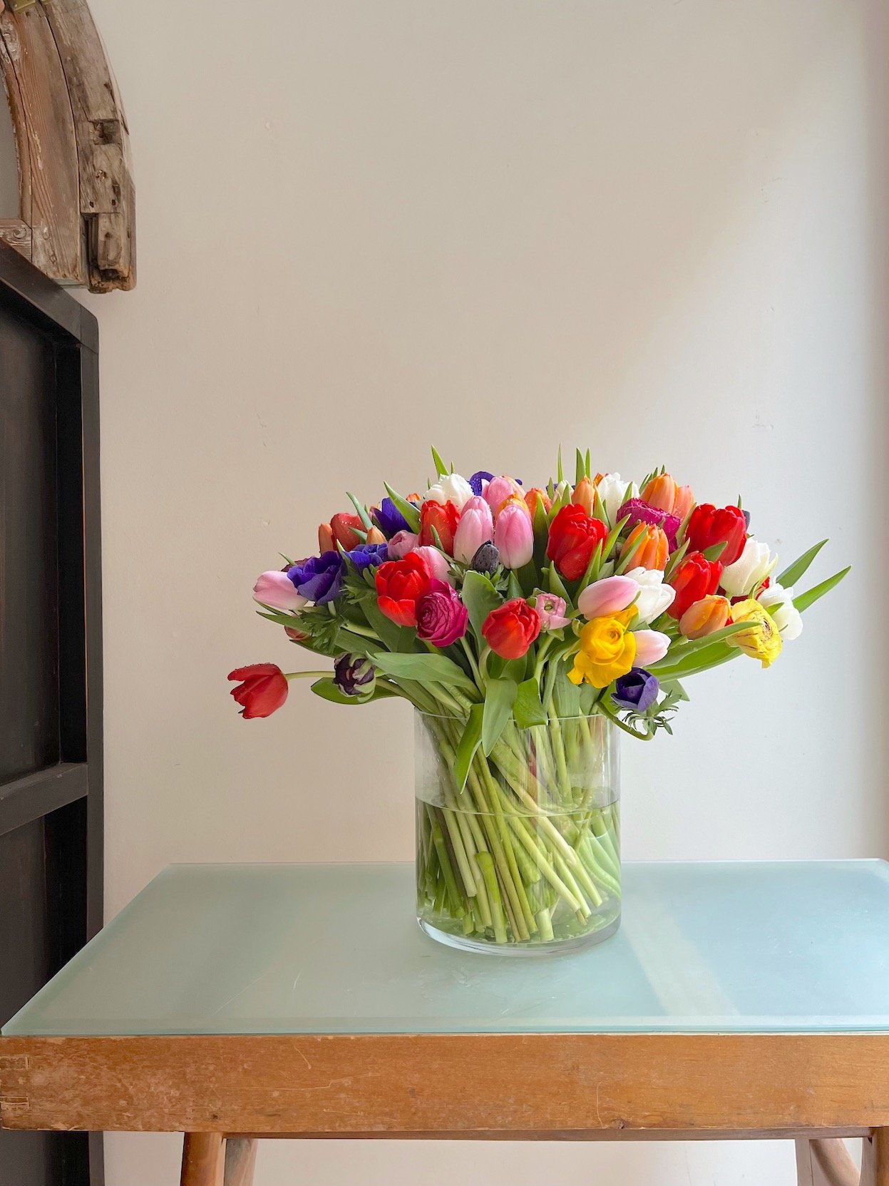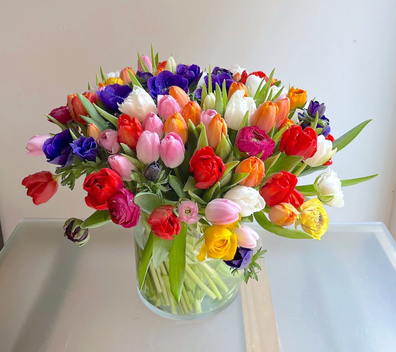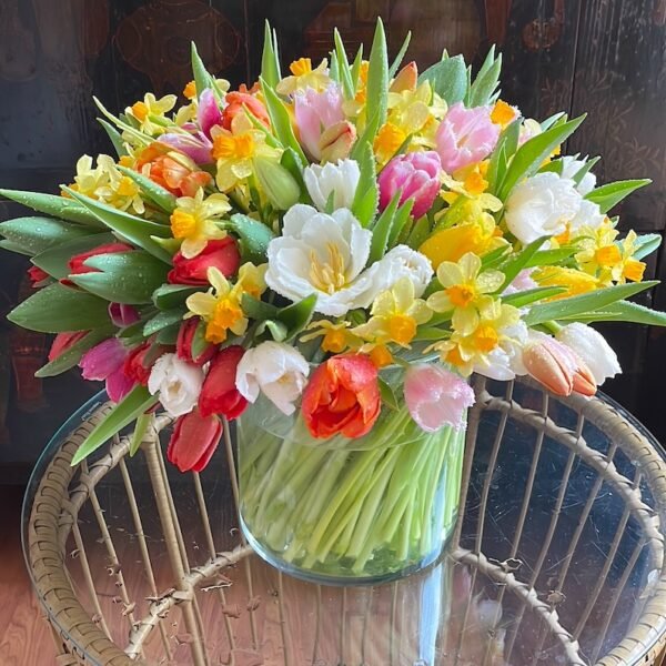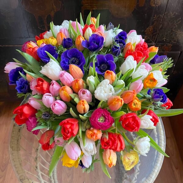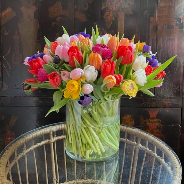 Arreglo grande de flores de bulbos: Tulipanes, Anémonas, Ranúnculos, Narcisos….sobre cilindro ancho de cristal.