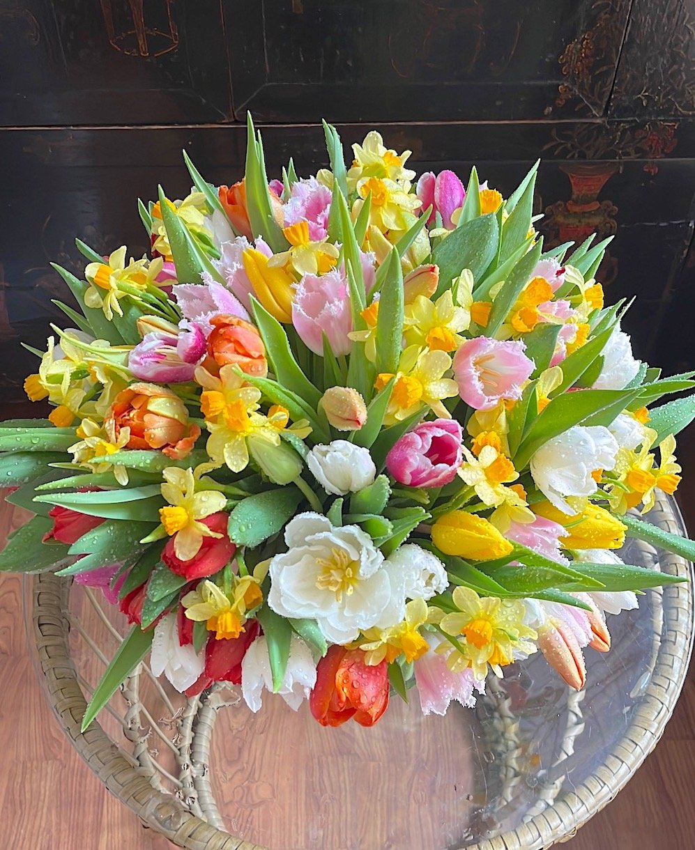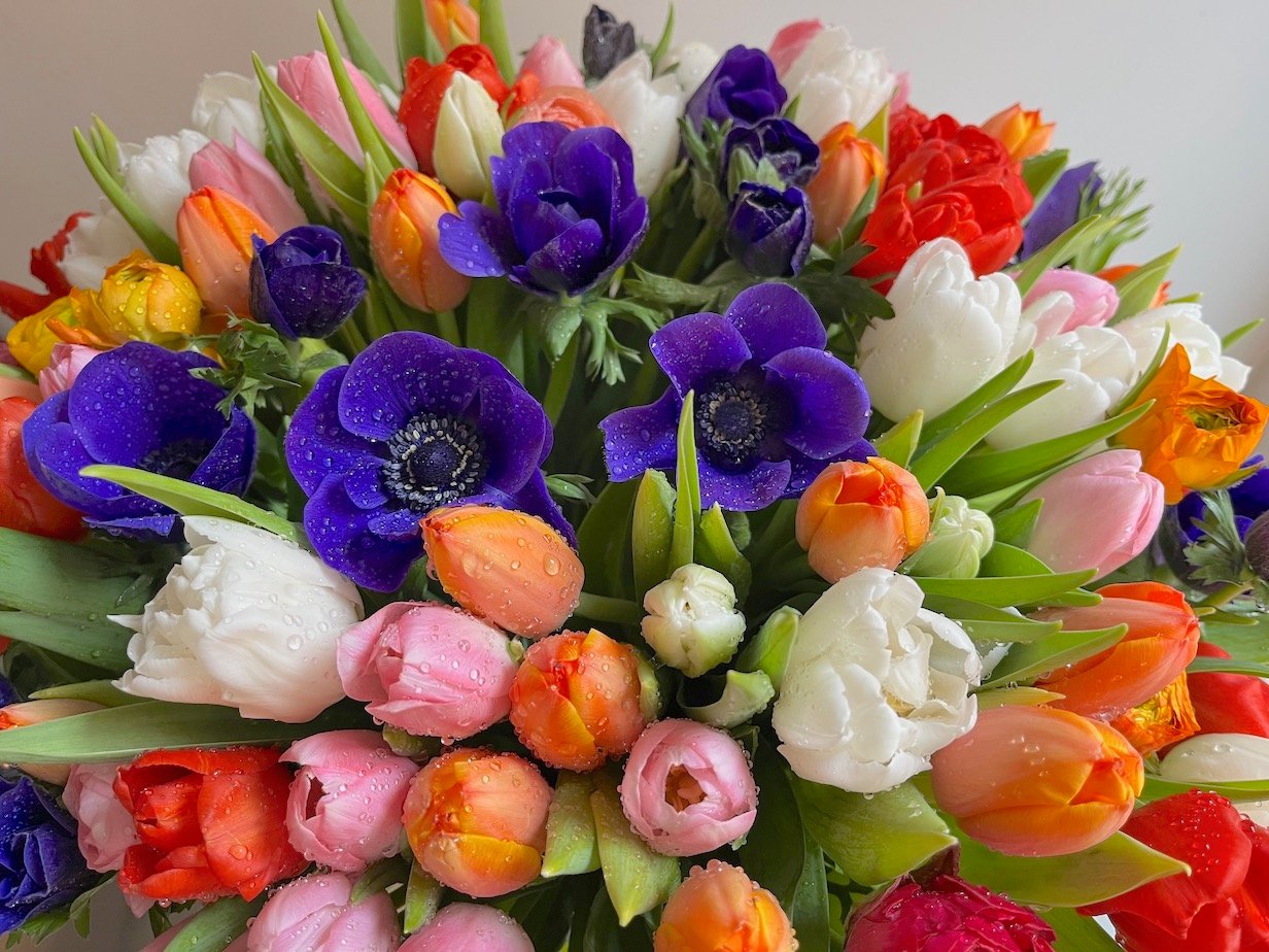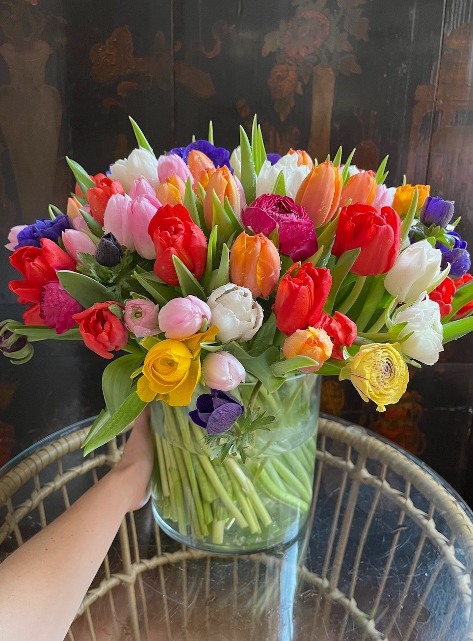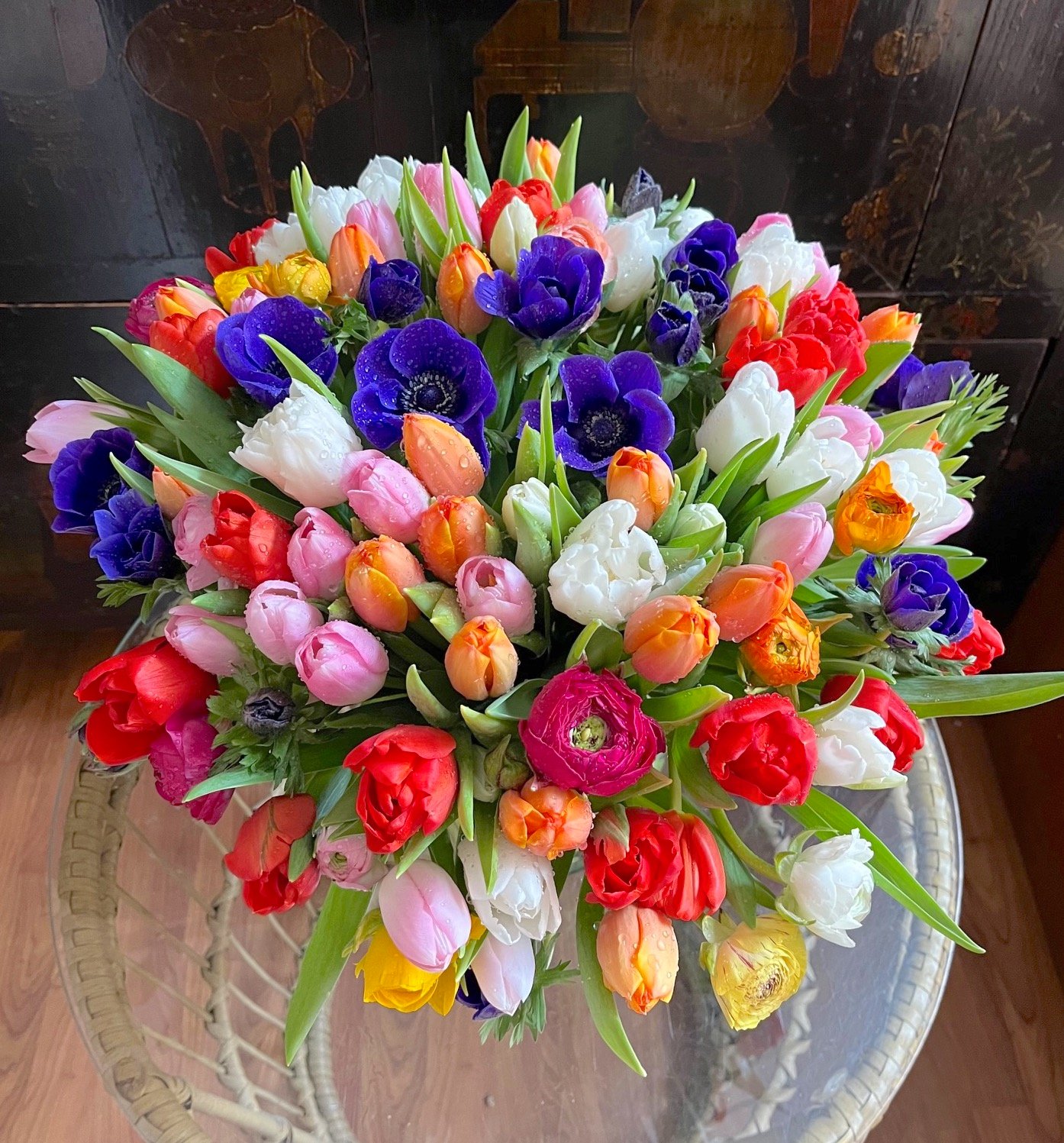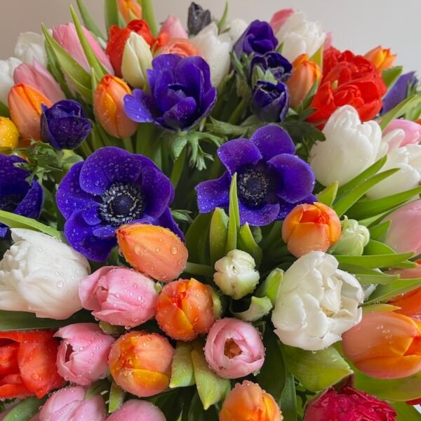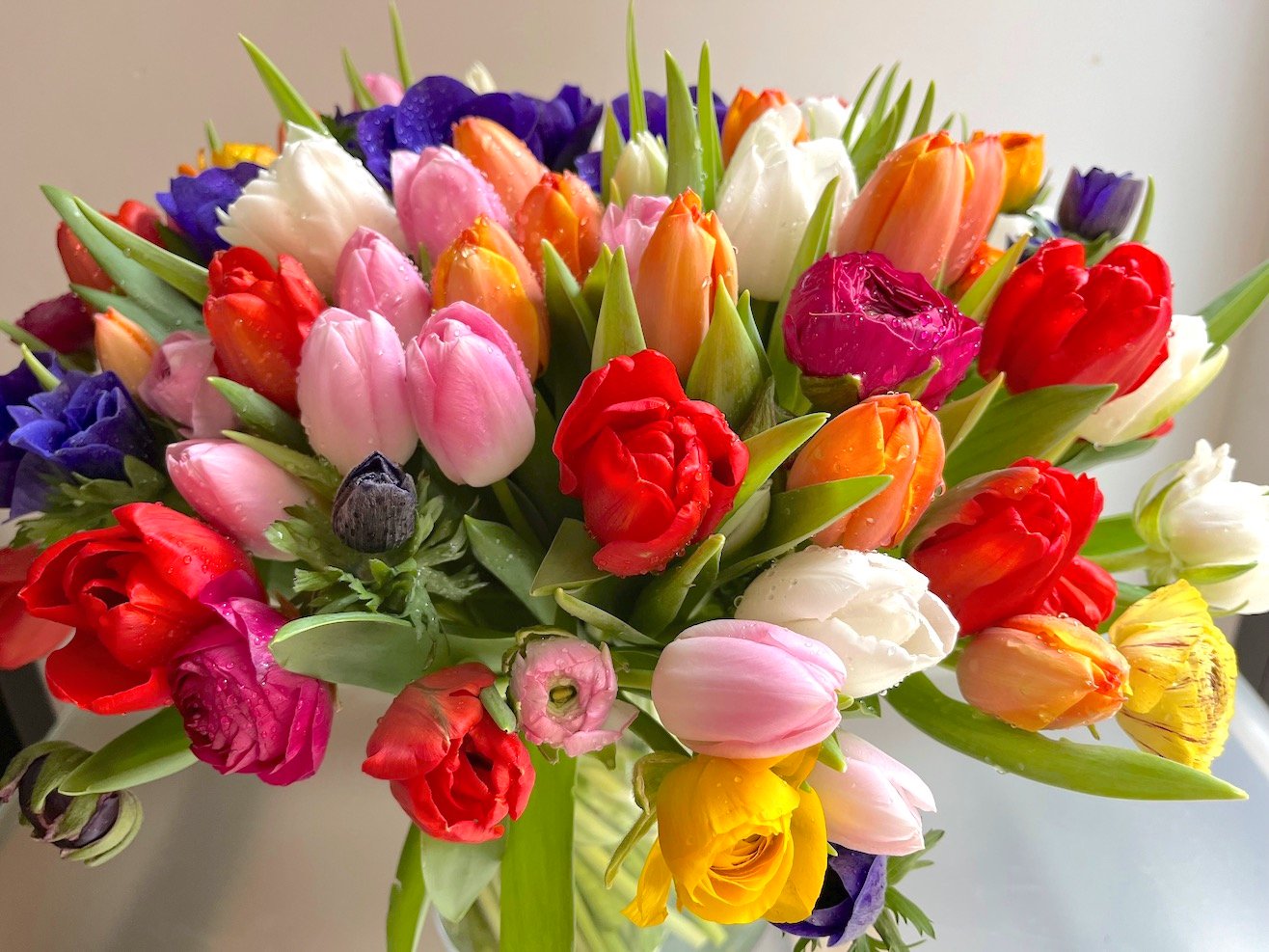 Arreglo grande de flores de bulbos: Tulipanes, Anémonas, Ranúnculos, Narcisos….sobre cilindro ancho de cristal.