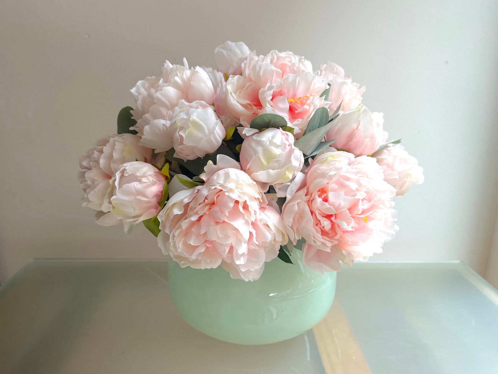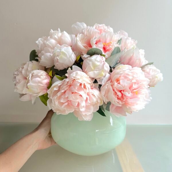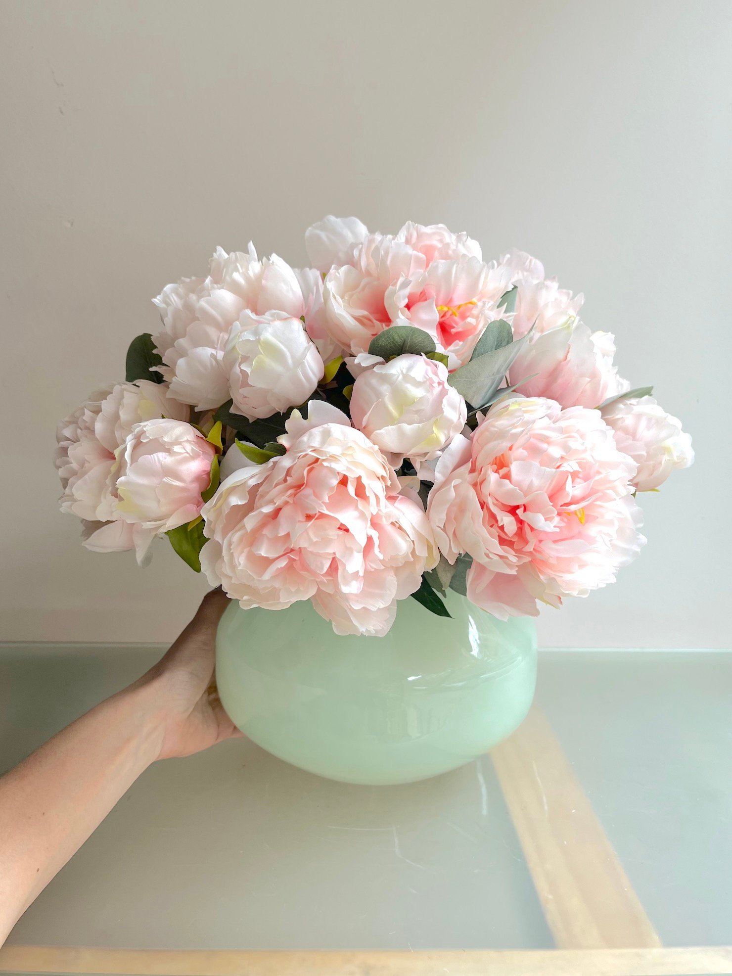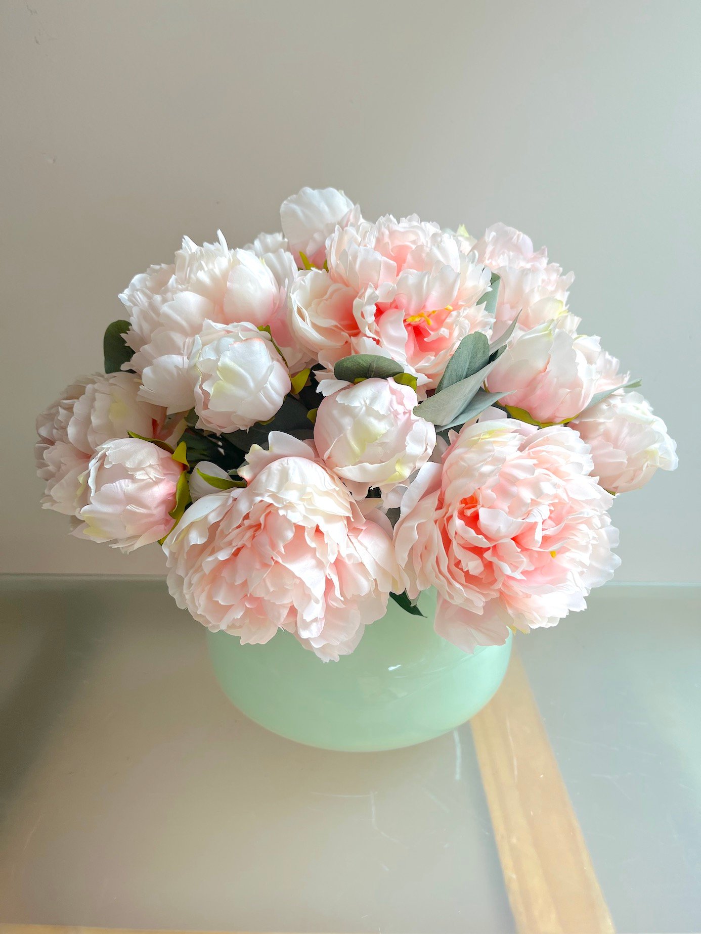 Precioso arreglo redondo y bajo de Peonias de tela en color rosa pálido sobre recipiente de cristal verde jade.