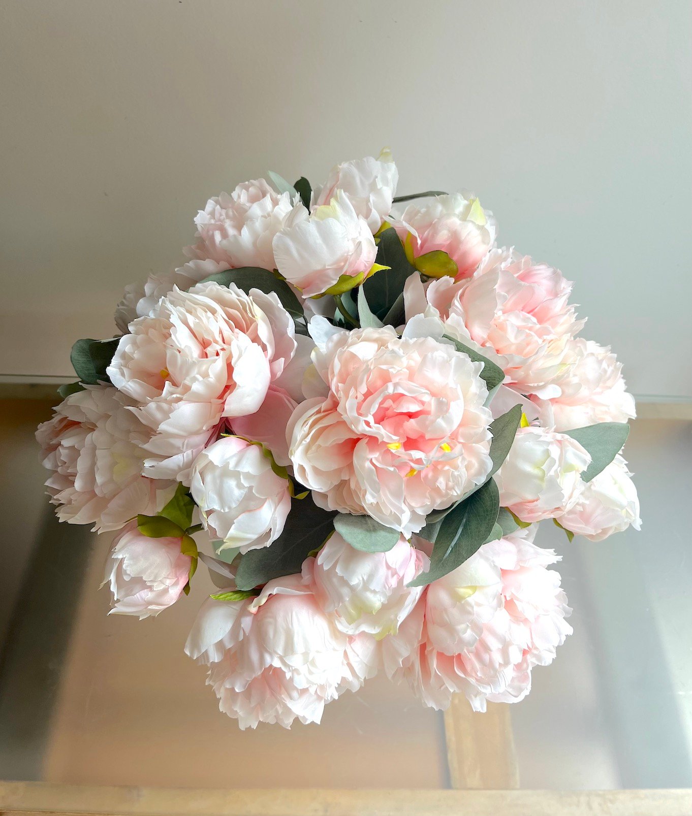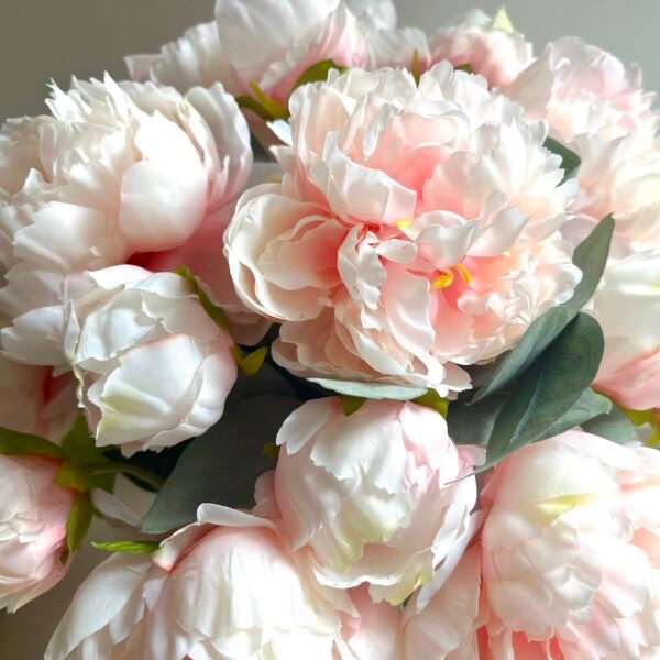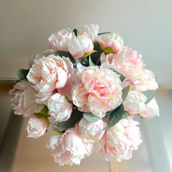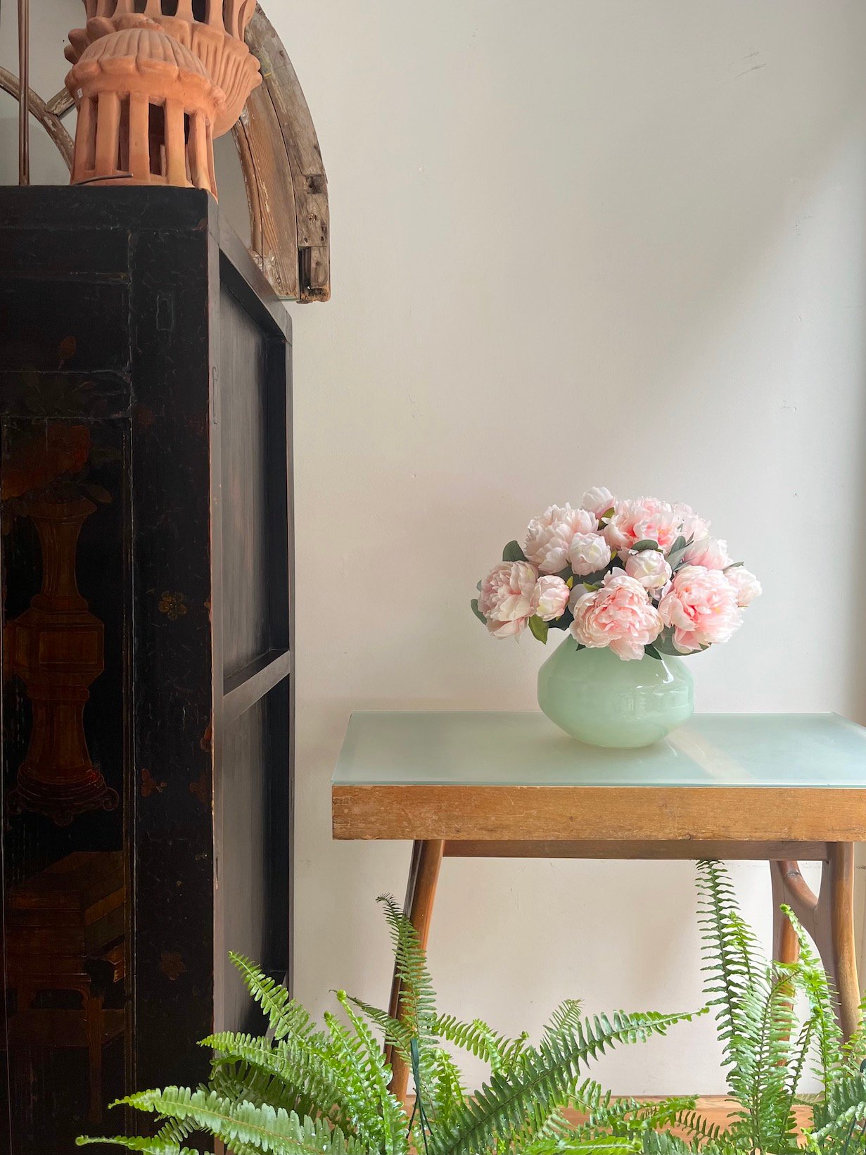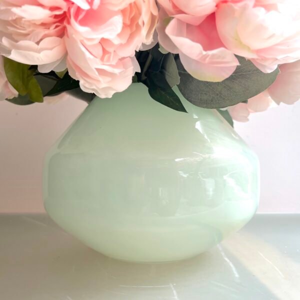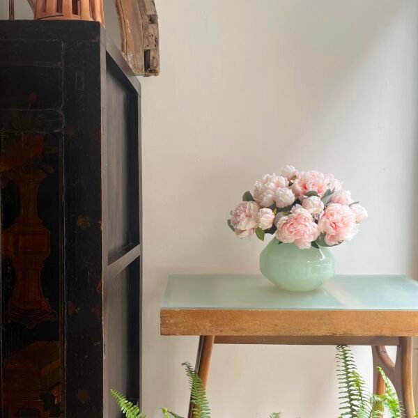 Precioso arreglo redondo y bajo de Peonias de tela en color rosa pálido sobre recipiente de cristal verde jade.