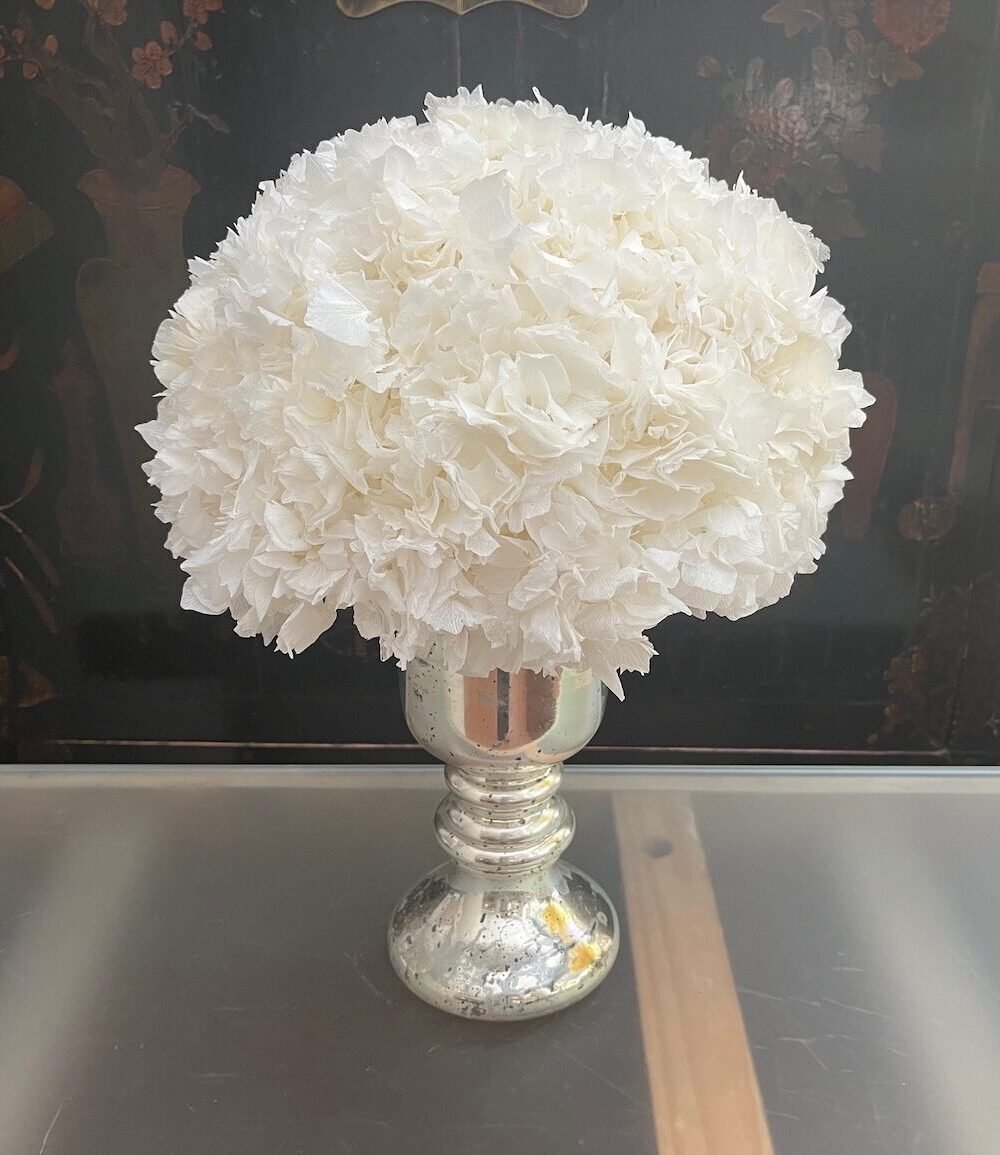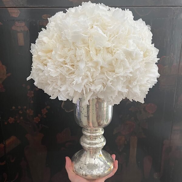 Arreglo de flores de Hortensia preservada en blanco roto sobre copa de cristal plateada.