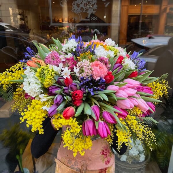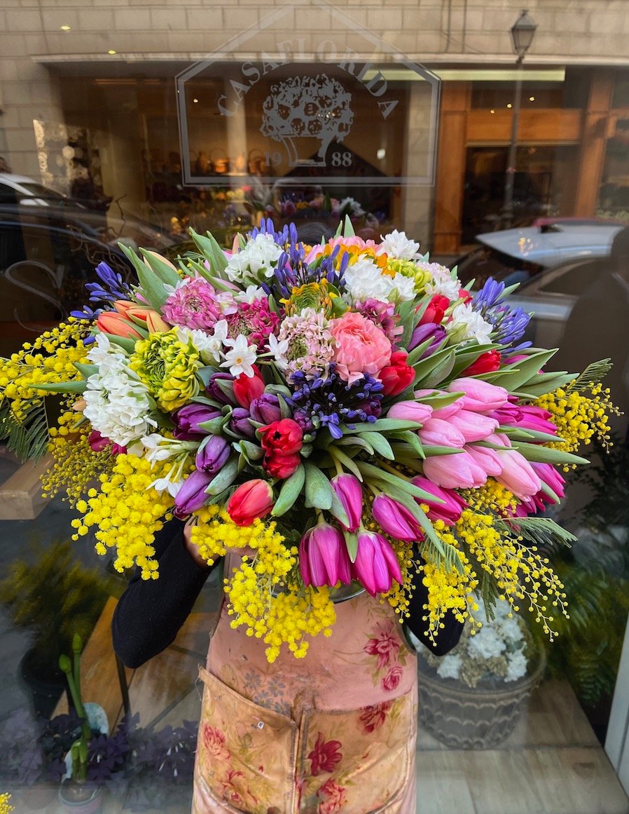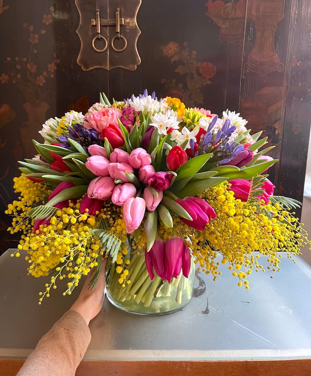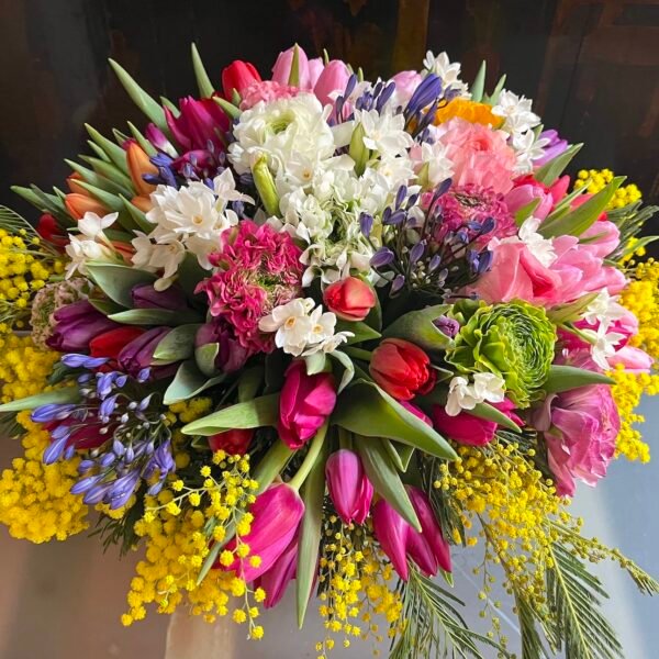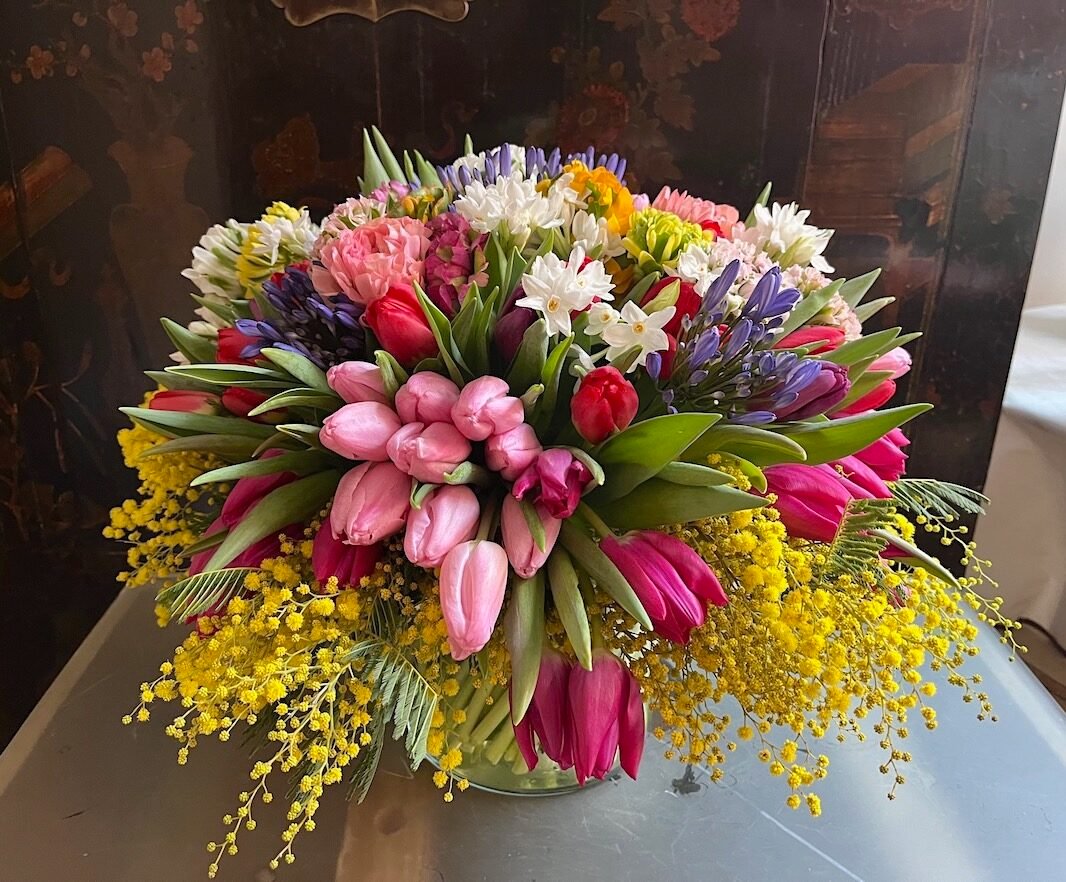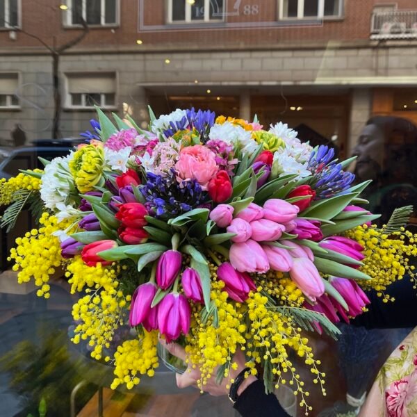 Espectacular centro colorido de flores de invierno: Tulipanes, Ranúnculos, Narcisos, etc. con ramas de Mimosa, sobre recipiente sencillo de cristal.