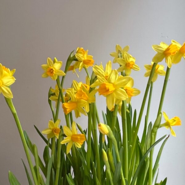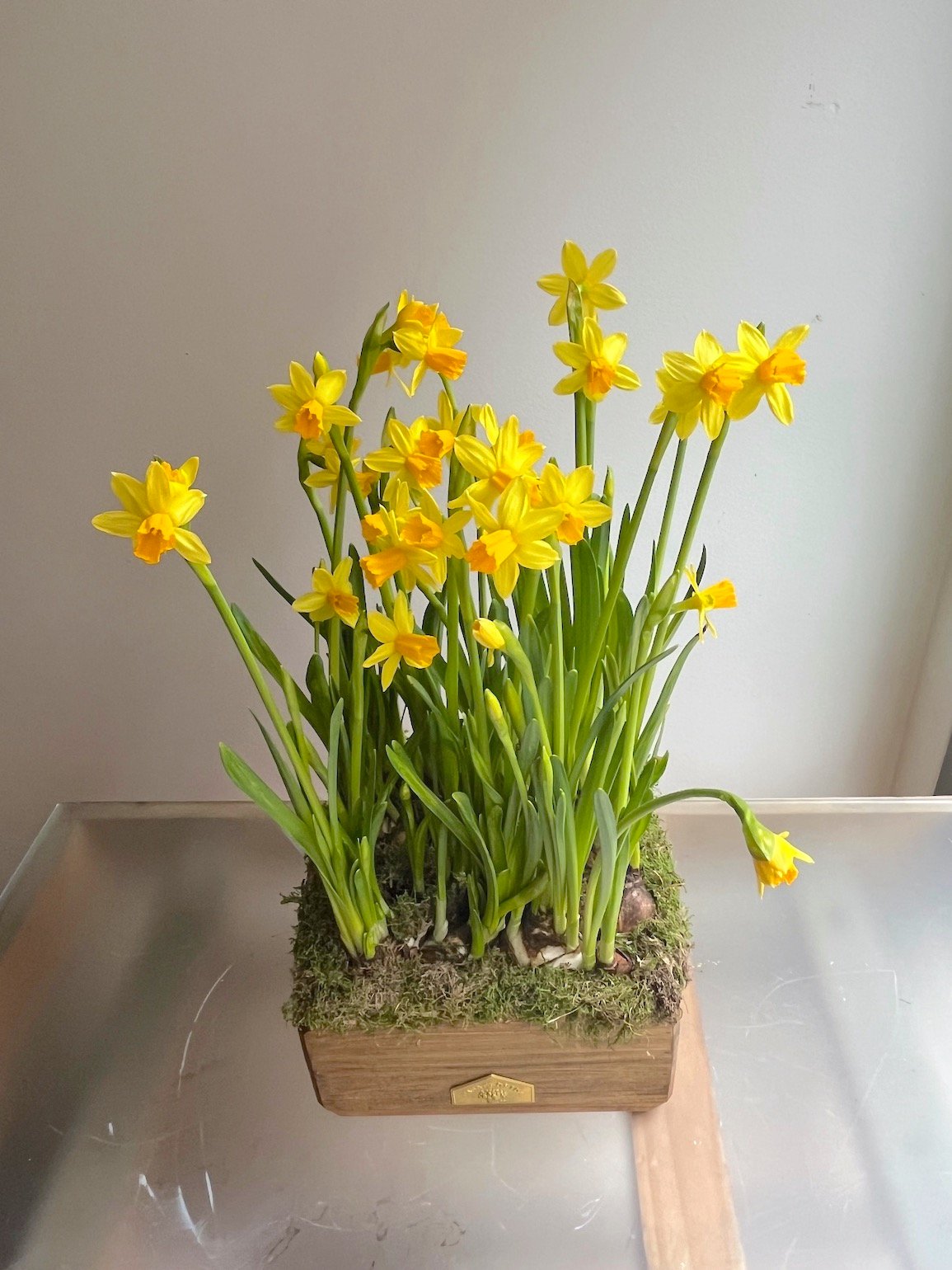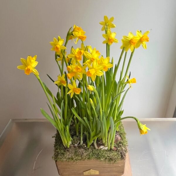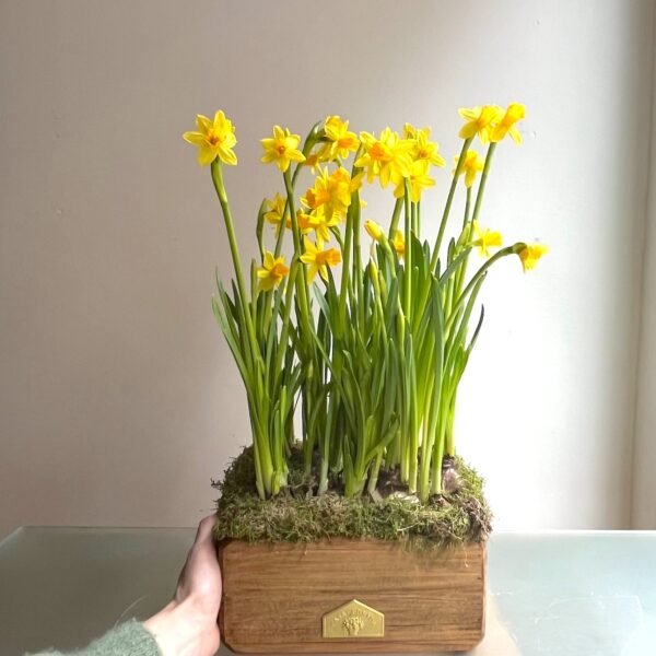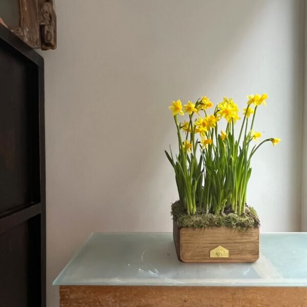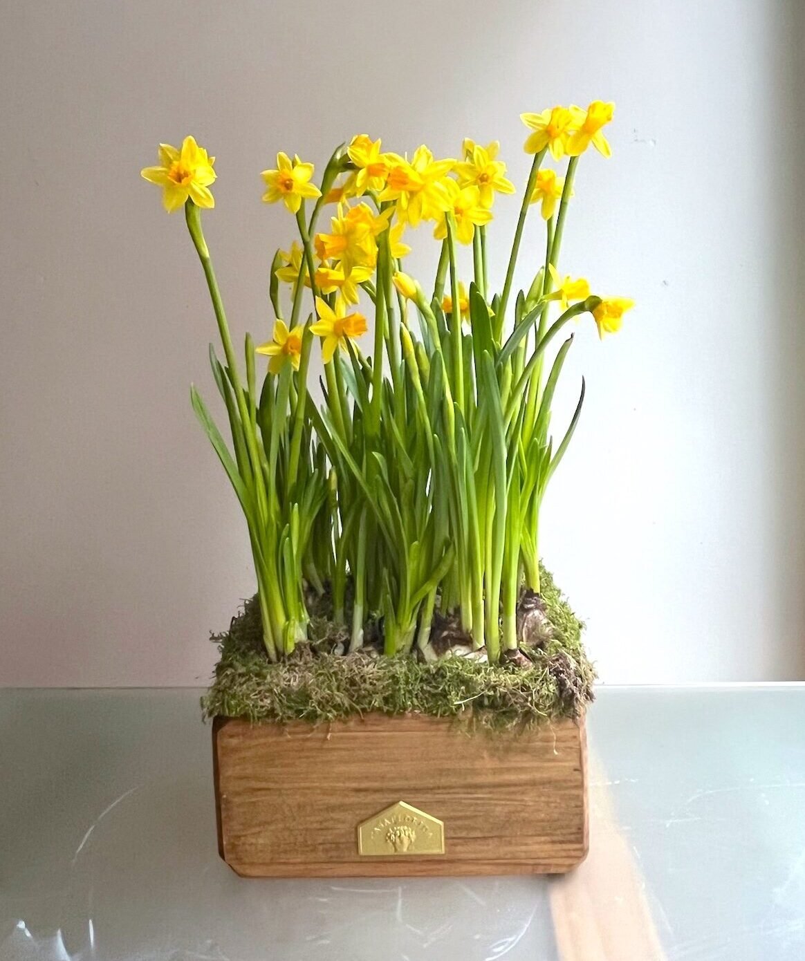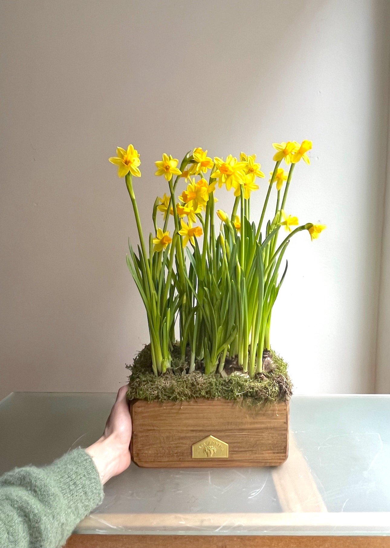 Arreglo de bulbos de Narcisos sobre cajón de madera. Flor de temporada