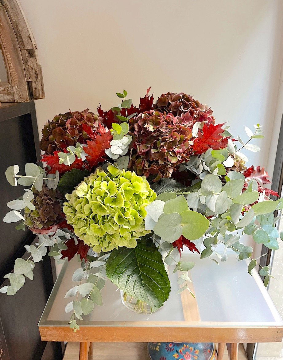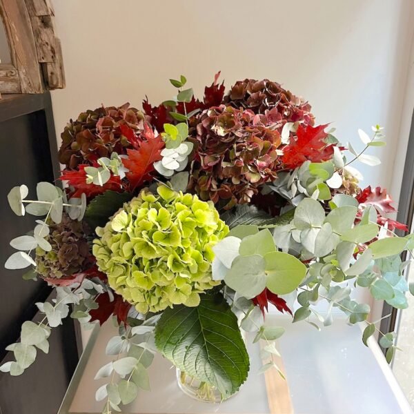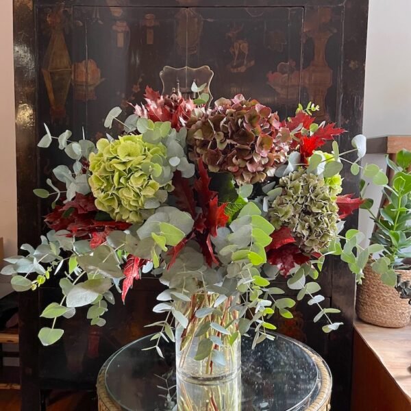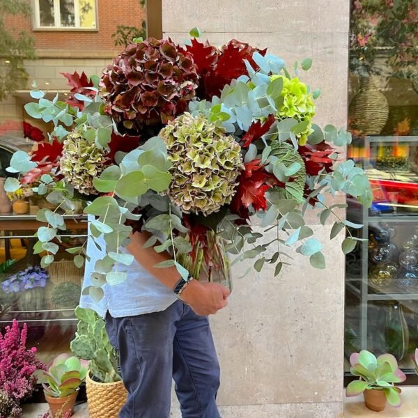 Arreglo alto y grande compuesto con flores de Otoño: Hortensias, hojas de Roble y Eucalipto. Los colores de las Hortensias pueden variar según disponibilidad.