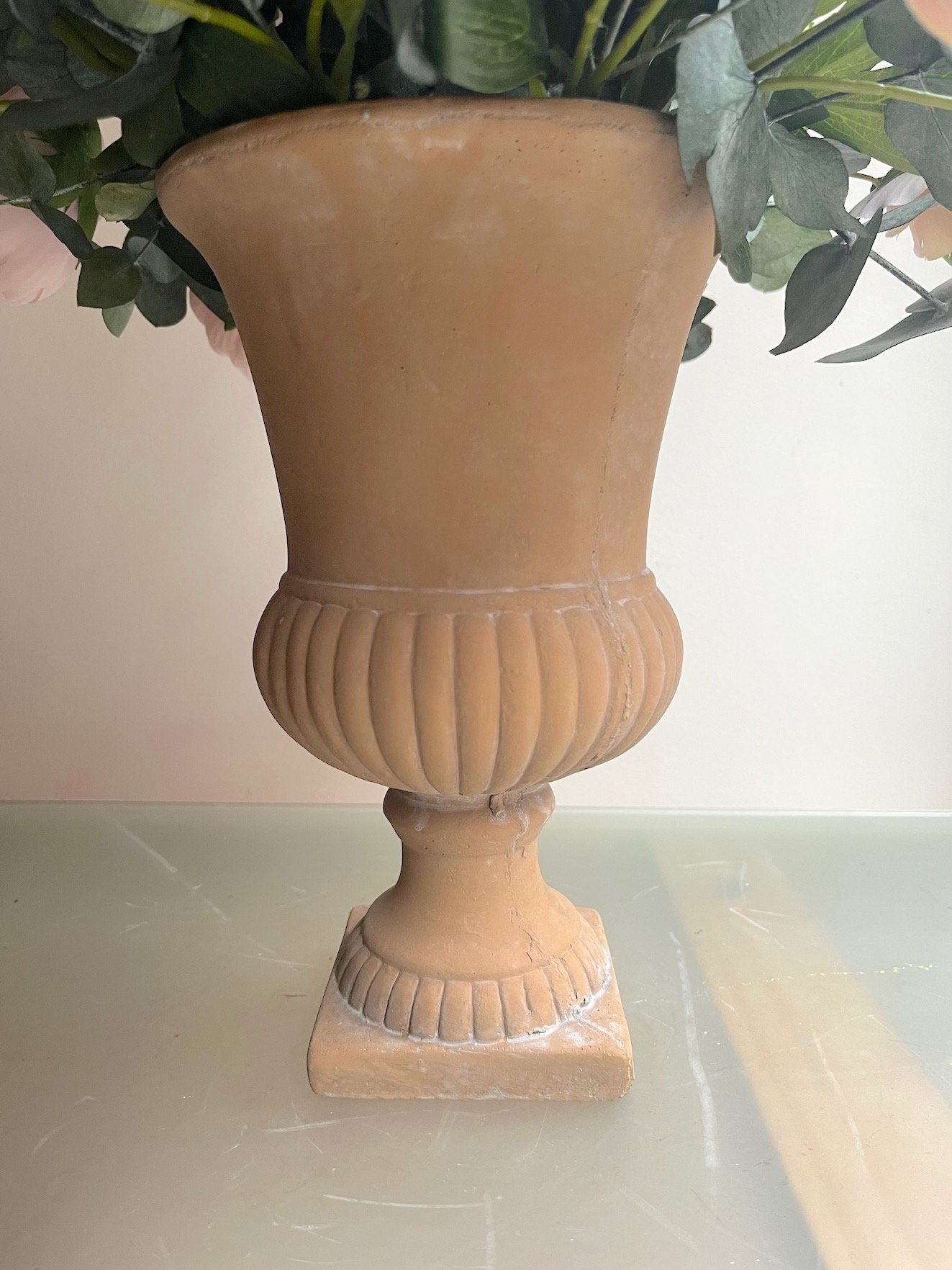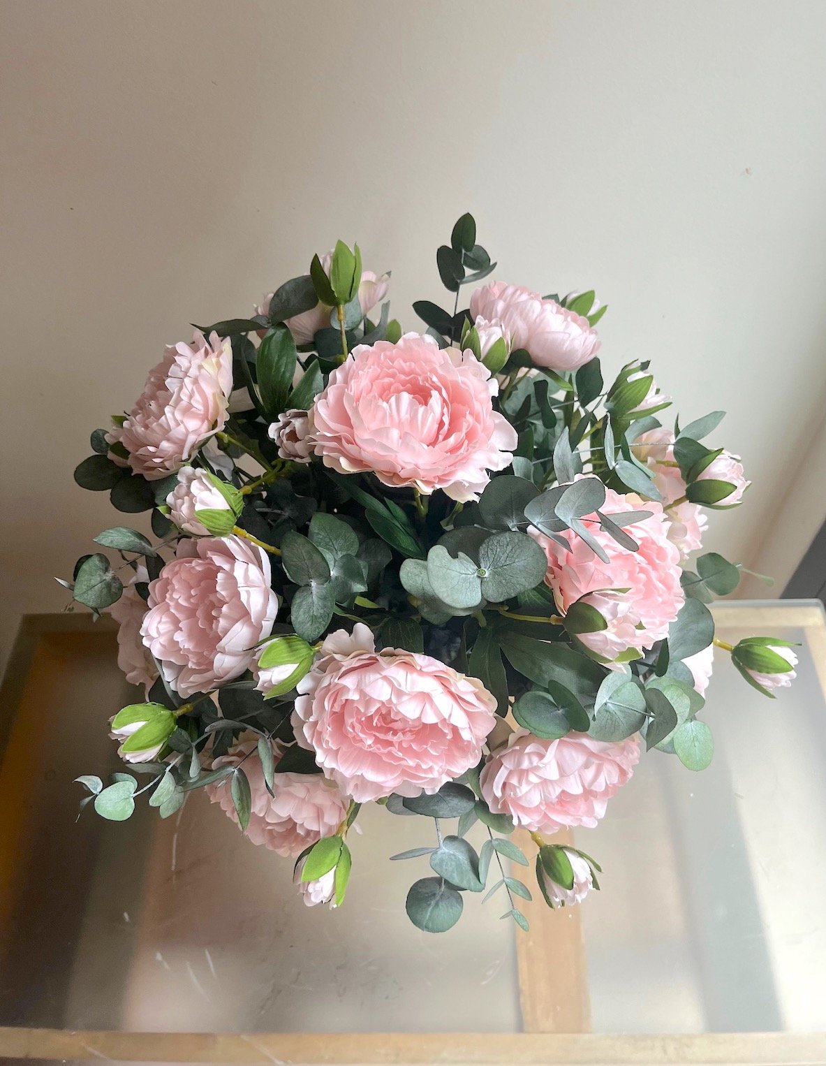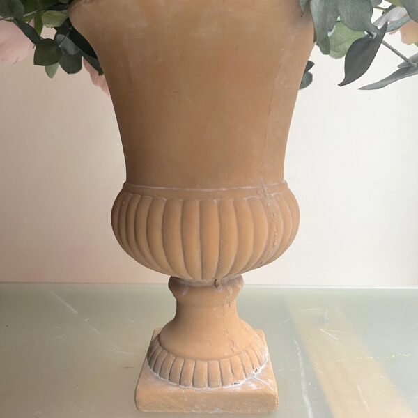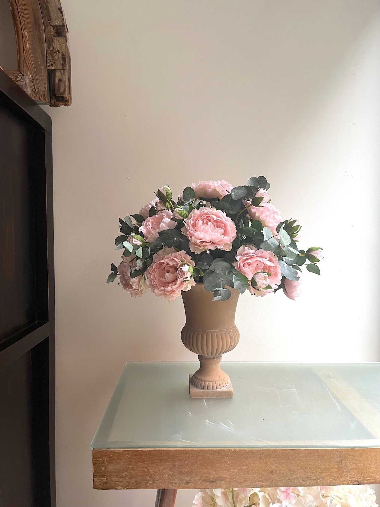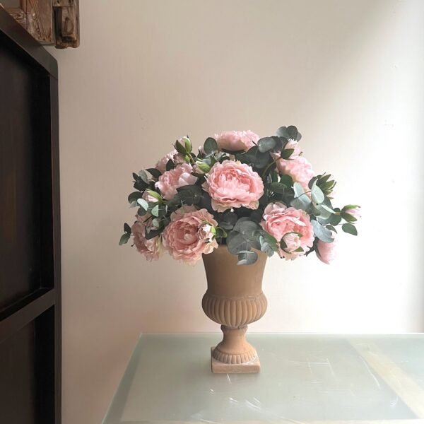 Arreglo de Rosas de Jardín de tela con eucalipto preservado sobre clásica copa de terracota.