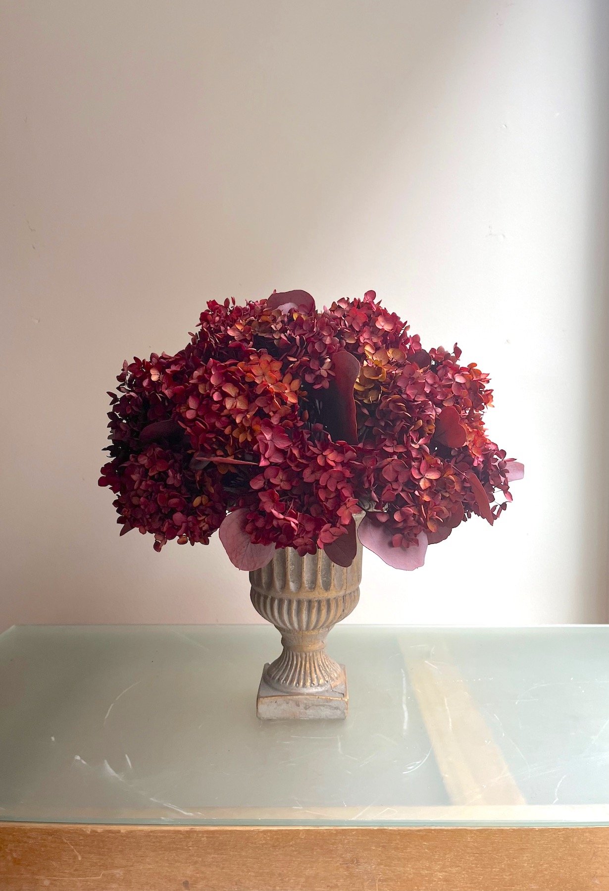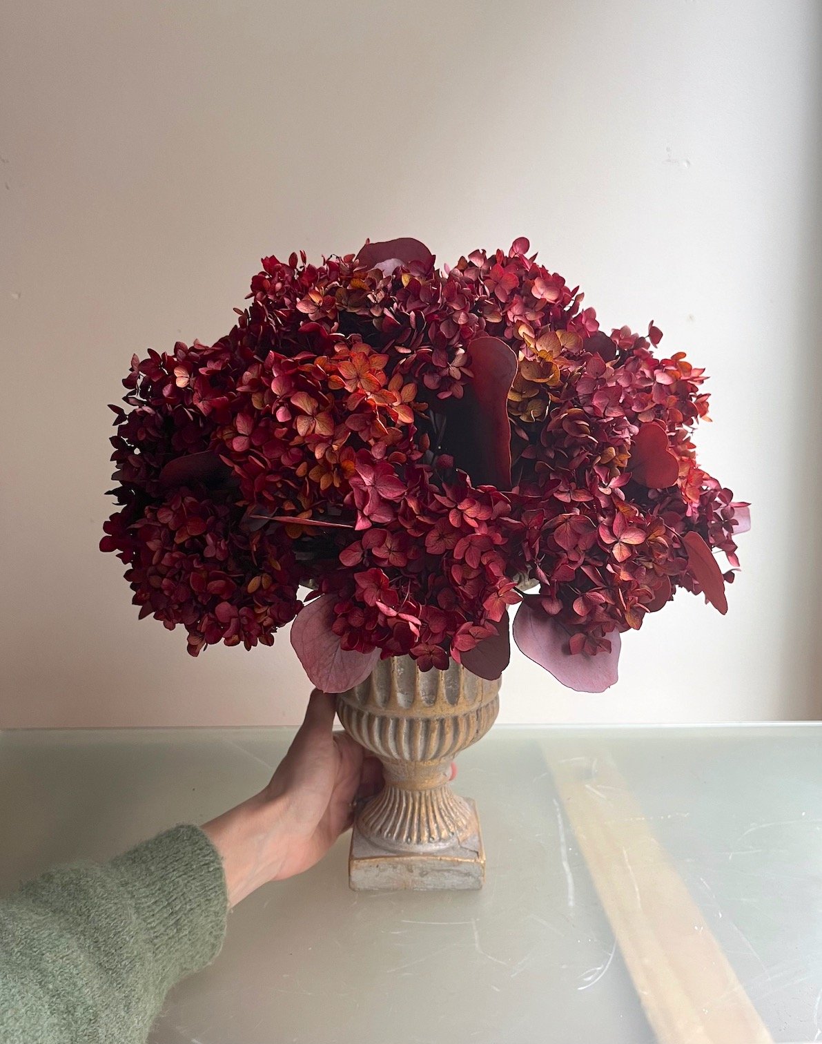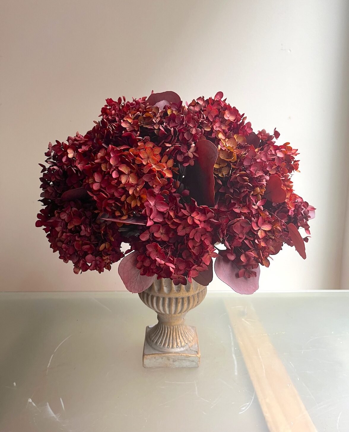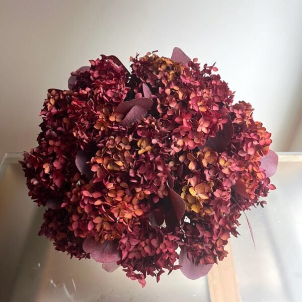Arreglo de flores de Hortensia y eucalipto preservado en granate sobre copa de terracota.
