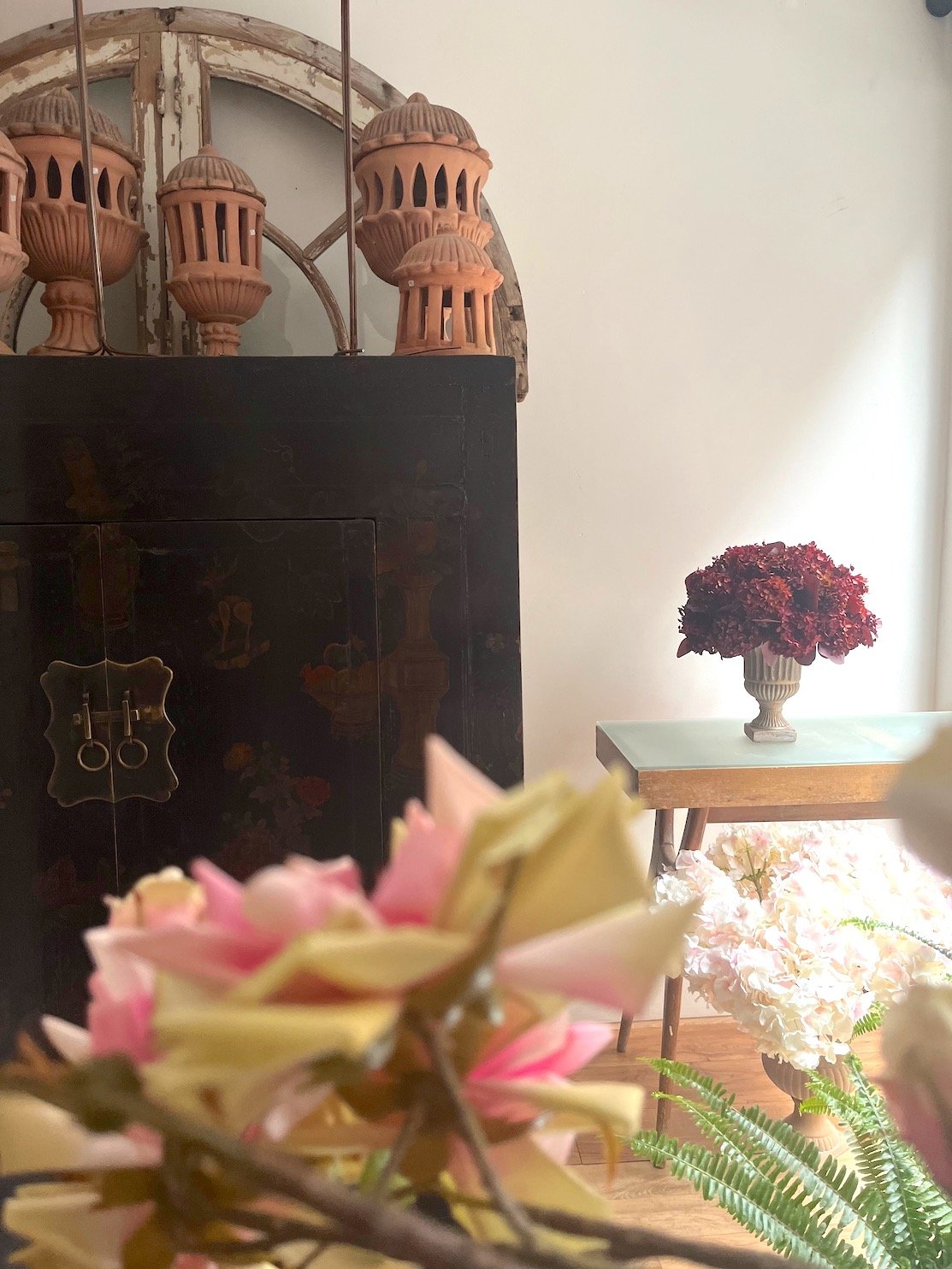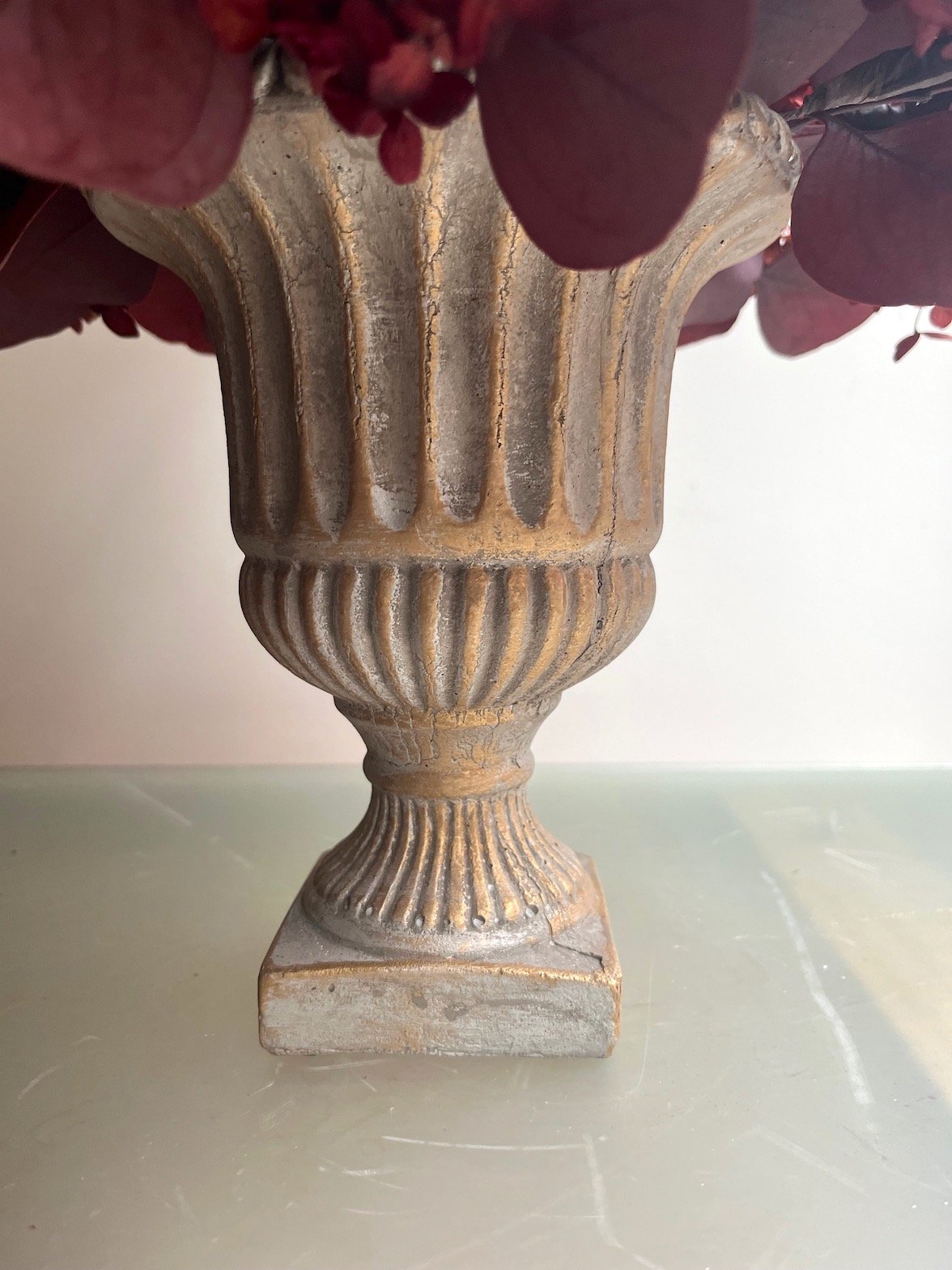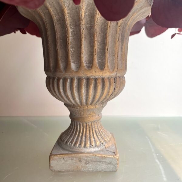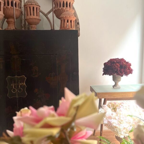 Arreglo de flores de Hortensia y eucalipto preservado en granate sobre copa de terracota.