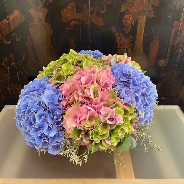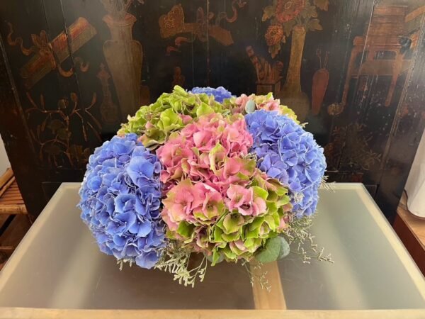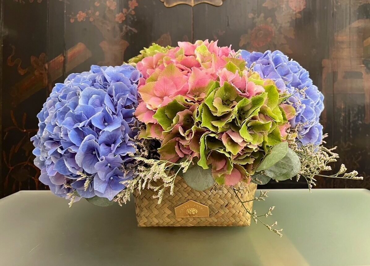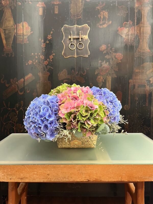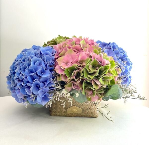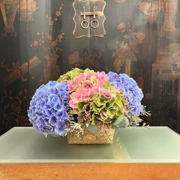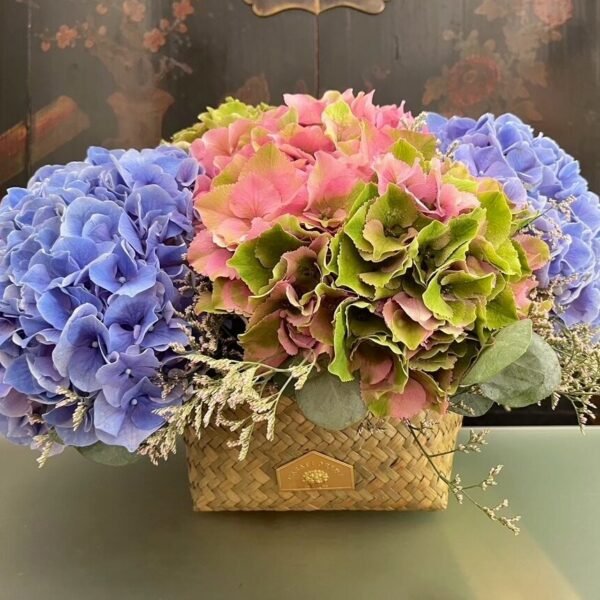 Arreglo bajo y ancho de Hortensias de colores sobre cesto artesanal, hecho en España. El color de las Hortensias puede variar ligeramente según disponibilidad.