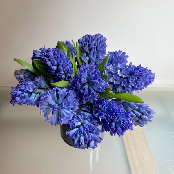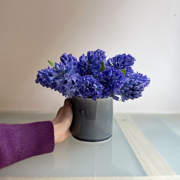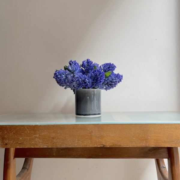 Arreglo de Jacintos, flor de temporada con su característico y rico olor, sobre recipiente de Fernando Alcalde, hecho a mano en España.