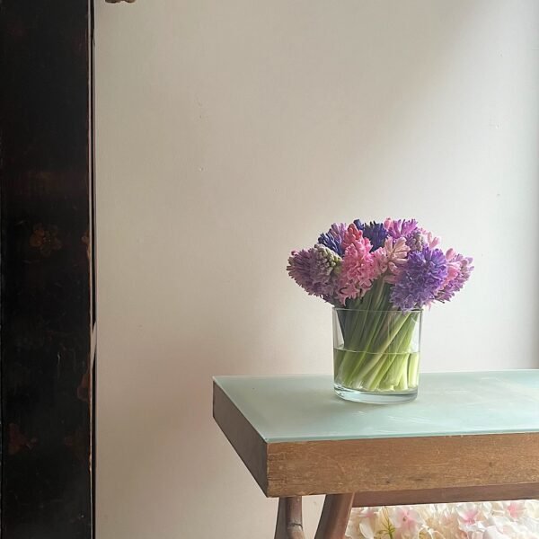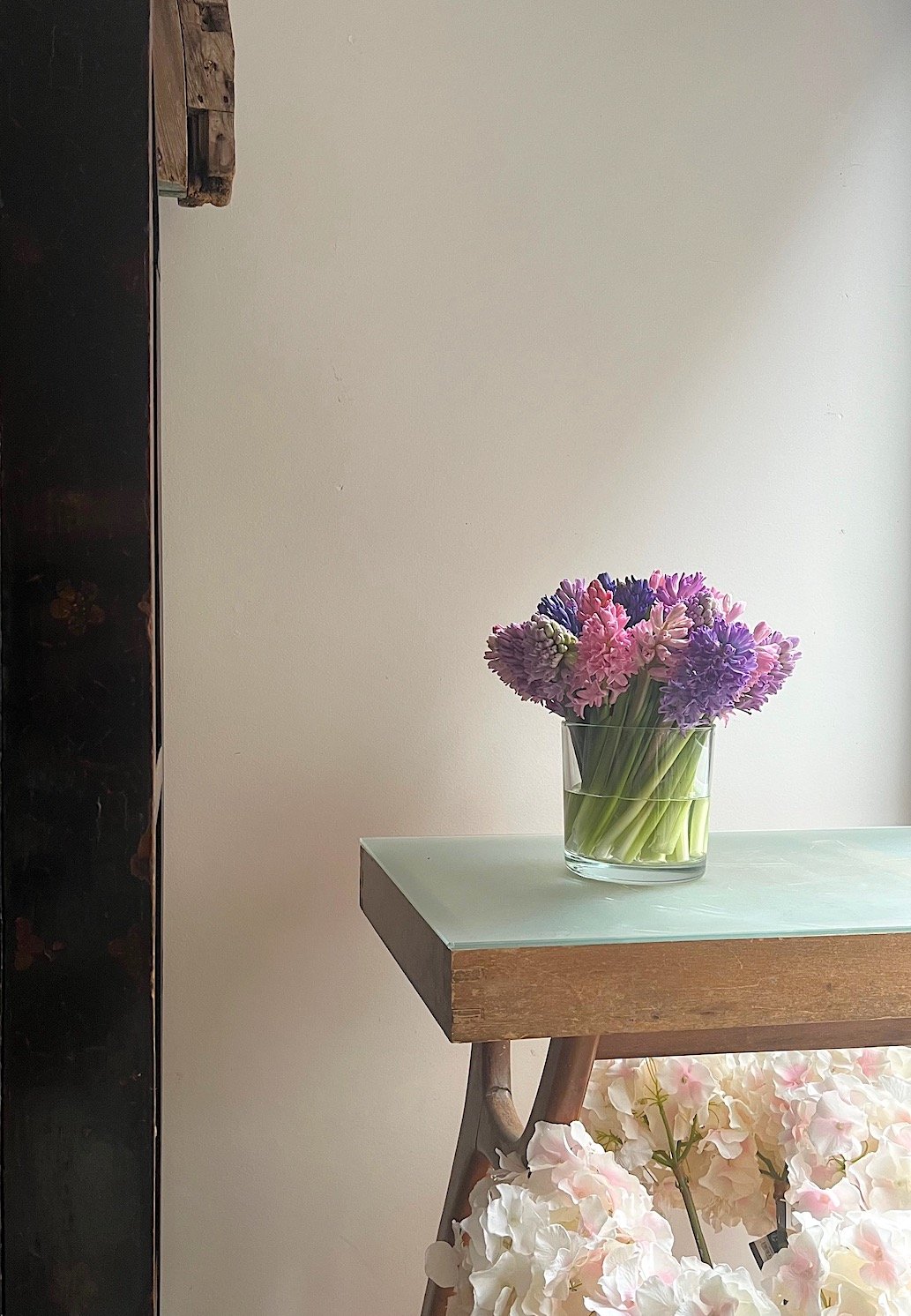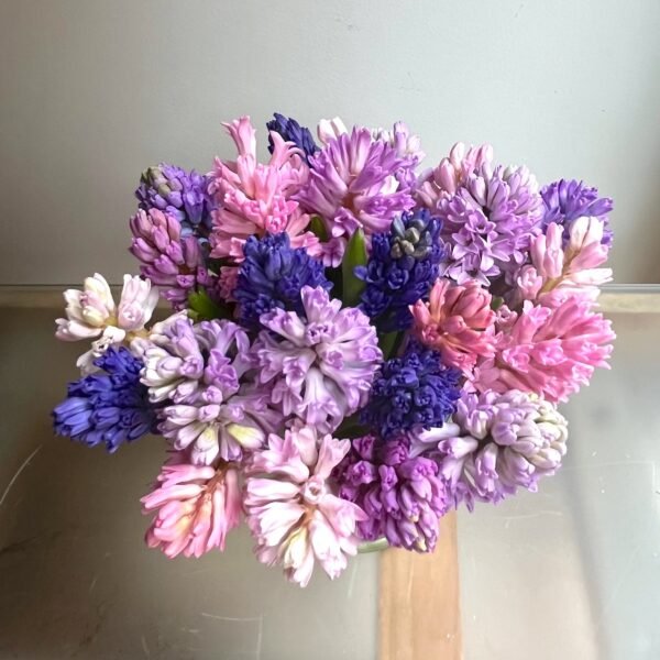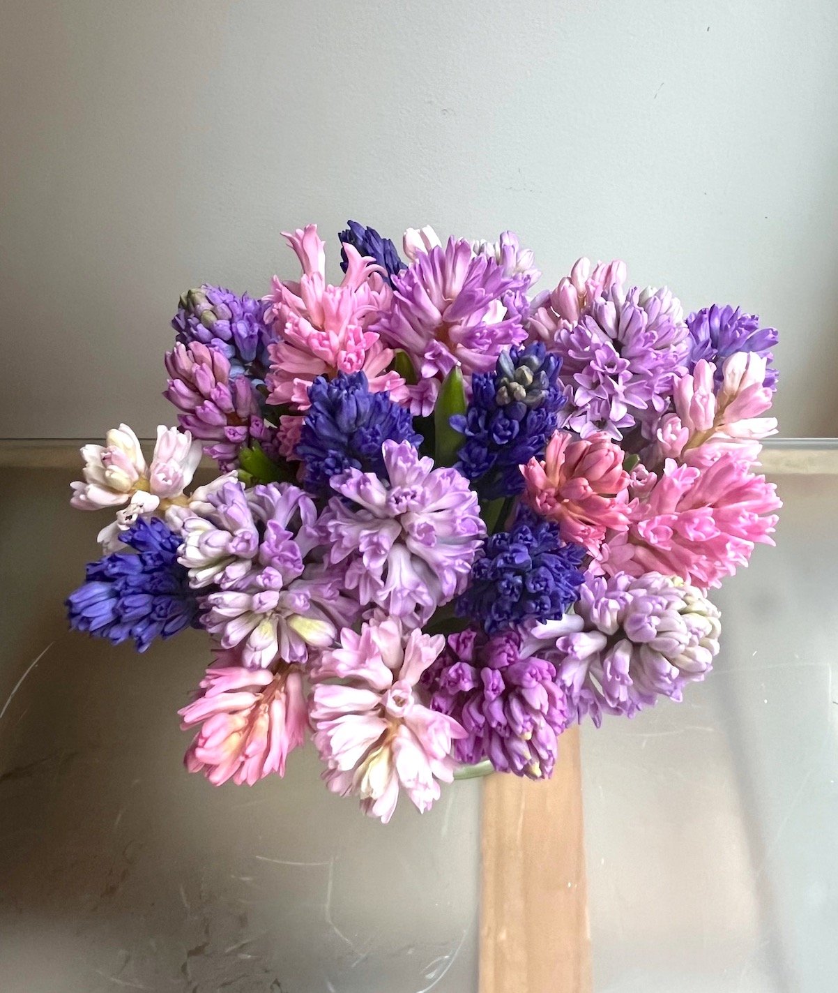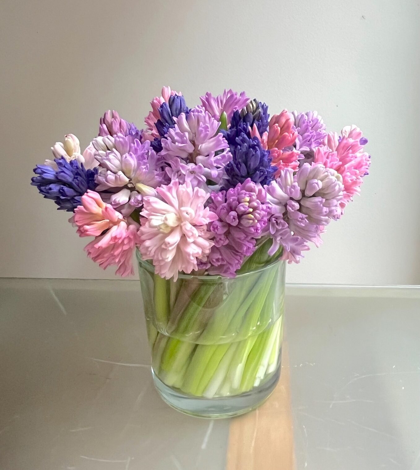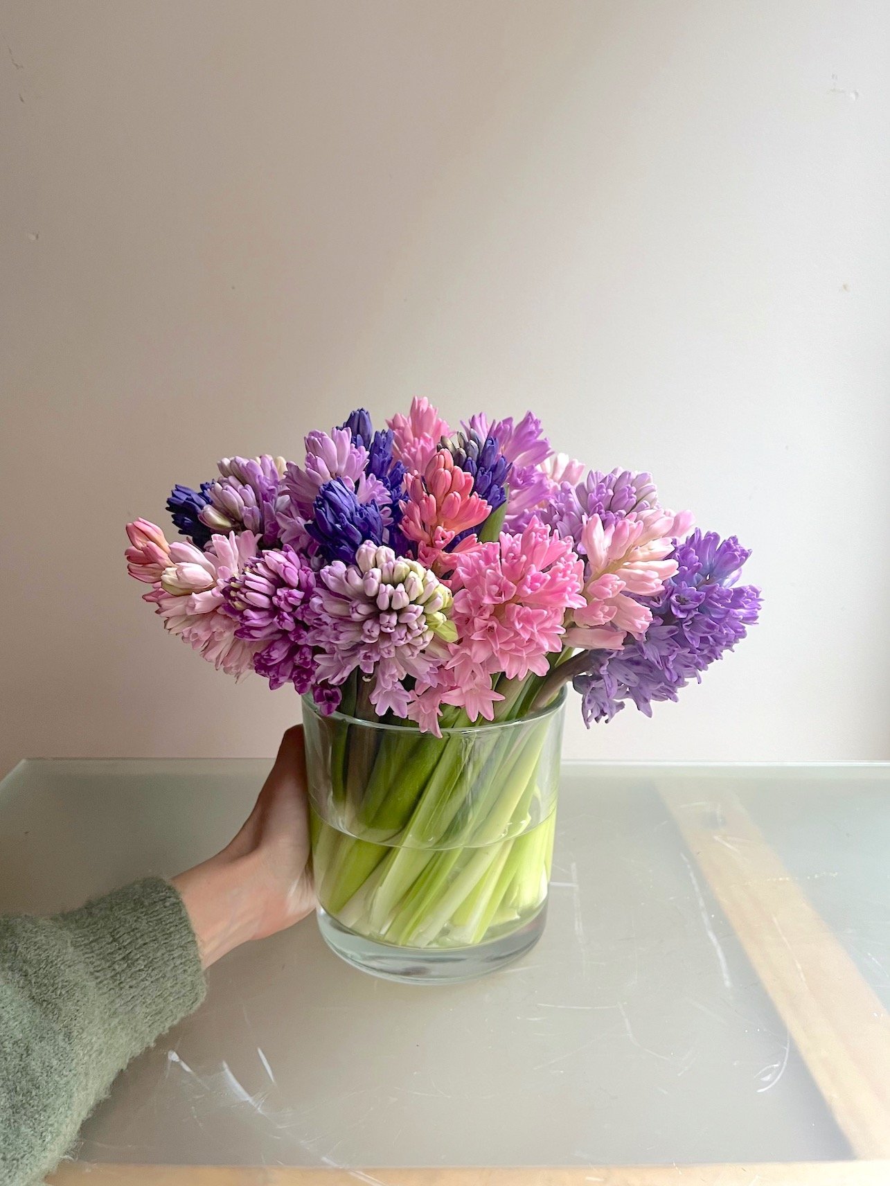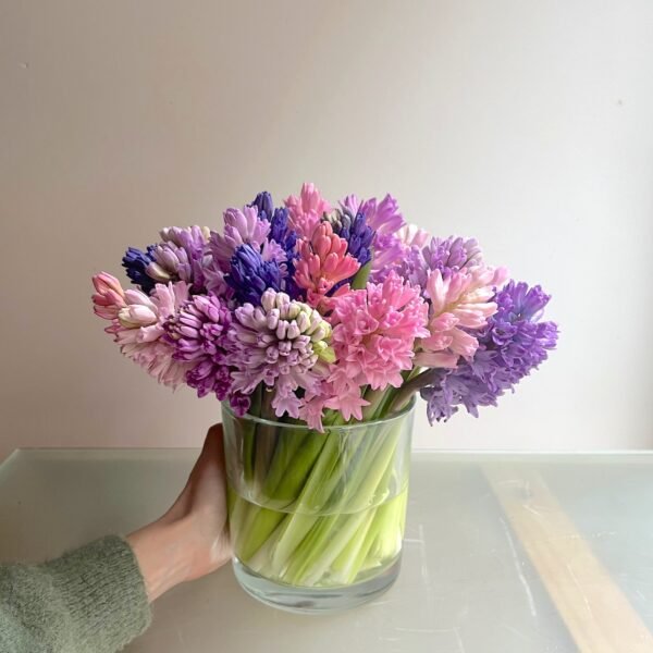 Arreglo de Jacintos de colores sobre cilindro de cristal. El jacinto es uno de los Bulbos de primavera que se caracteriza por su rico perfume. El colore de las flores puede variar ligeramente según disponibilidad