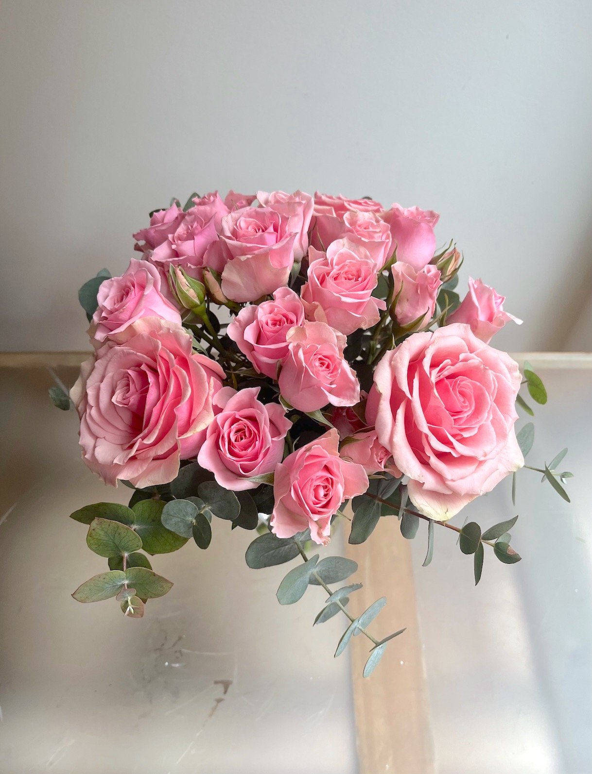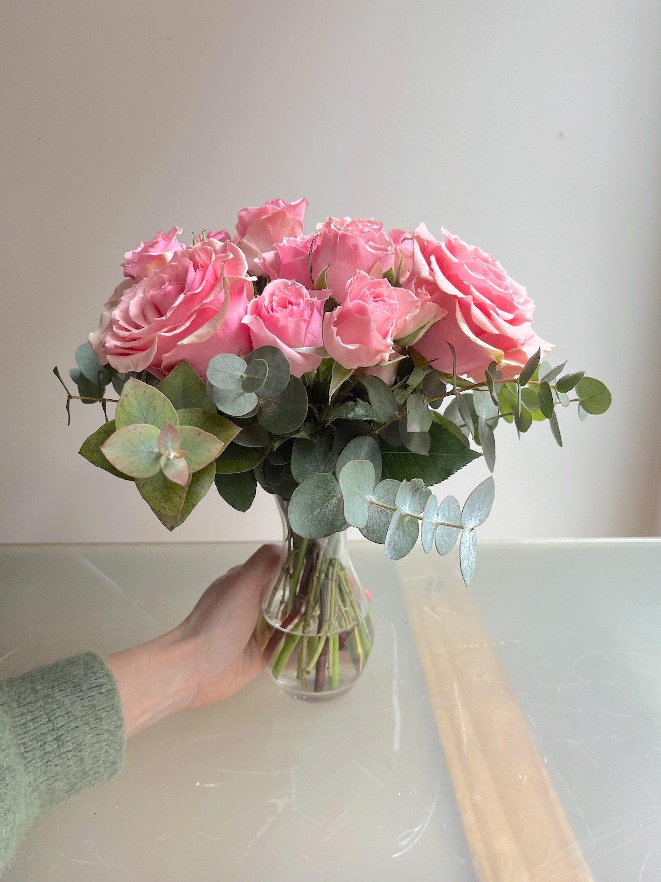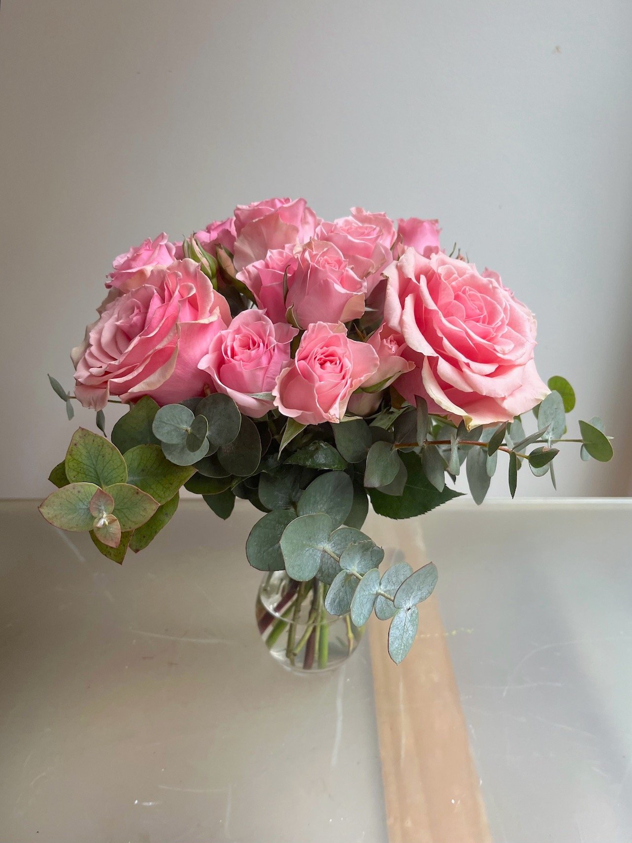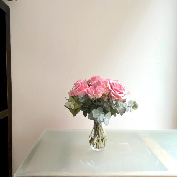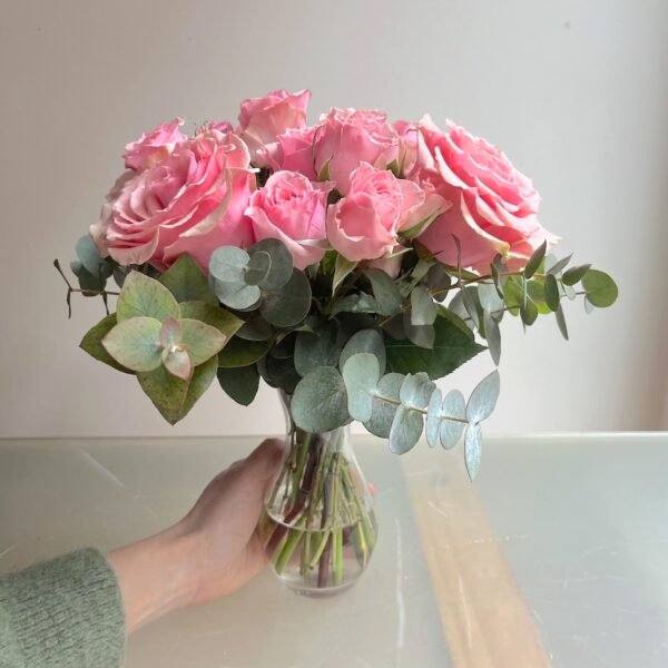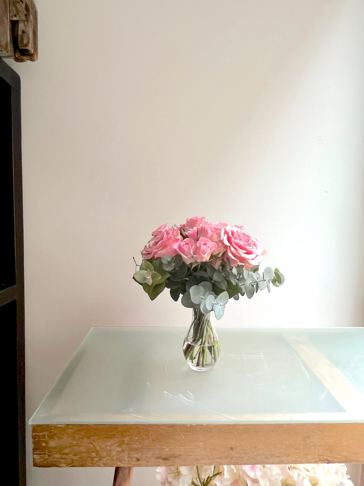 Cuidado detalle de Rosas grandes y de Pitiminí en color rosa sobre pequeño jarrón de cristal.