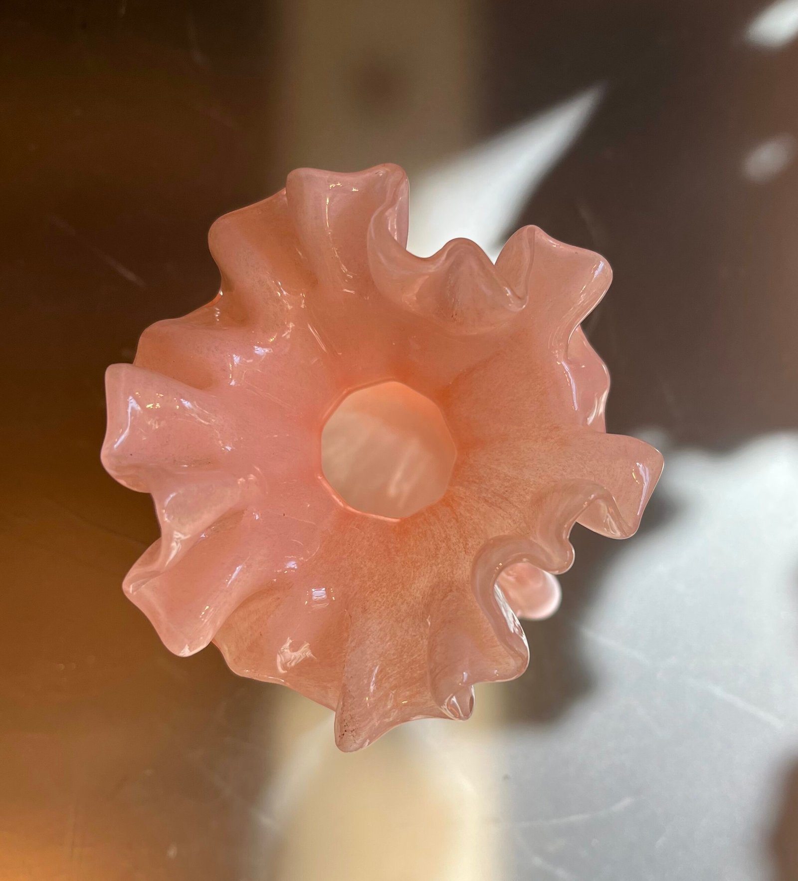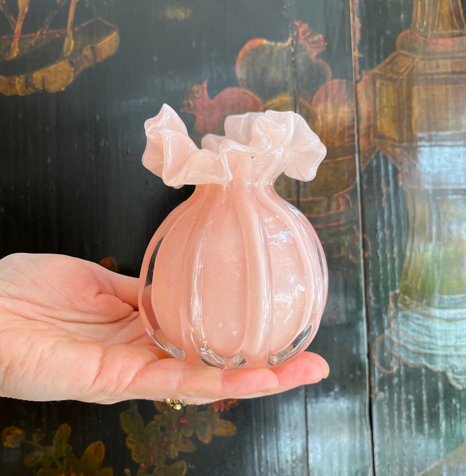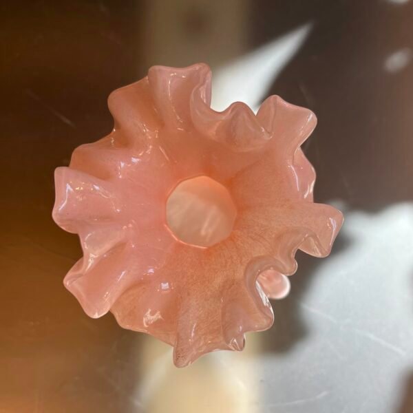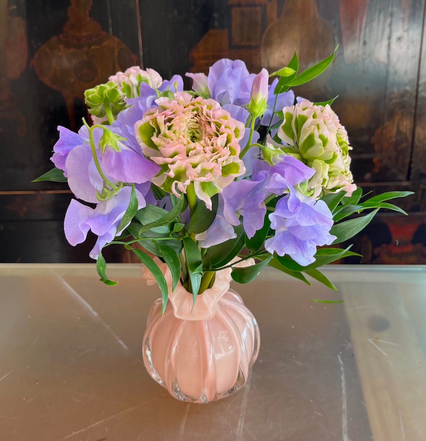 Detalle de flores de temporada sobre recipiente especial de cristal rosa. La flor puede variar ligeramente según la disponibilidad.