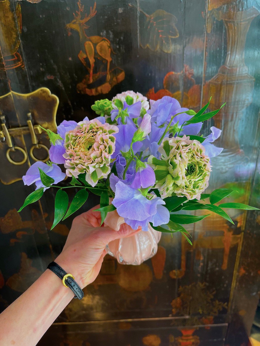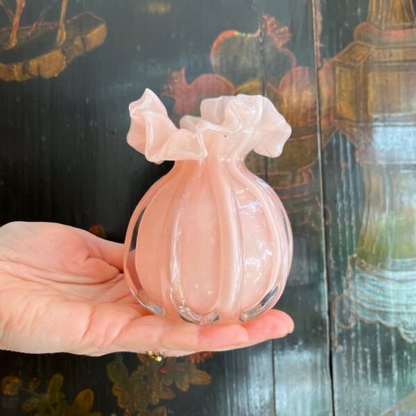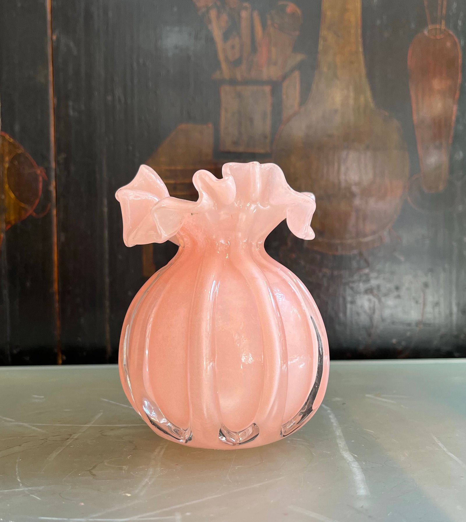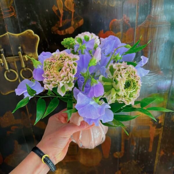 Detalle de flores de temporada sobre recipiente especial de cristal rosa. La flor puede variar ligeramente según la disponibilidad.