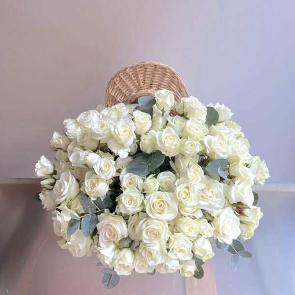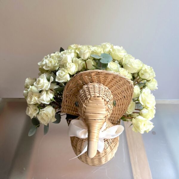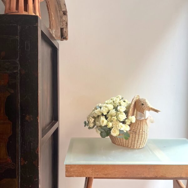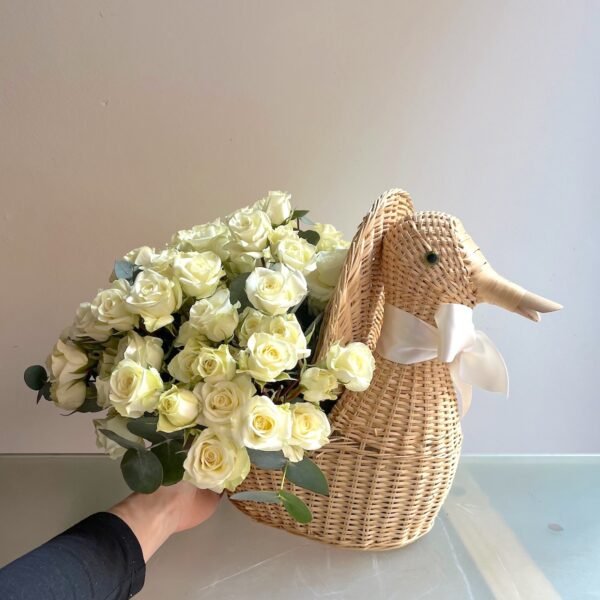 Arreglo para un nacimiento de bebé de Rosas sobre pato de mimbre artesanal. Se añadirá a la tarjeta un corazón o algún otro detalle que acompañe a la dedicatoria.