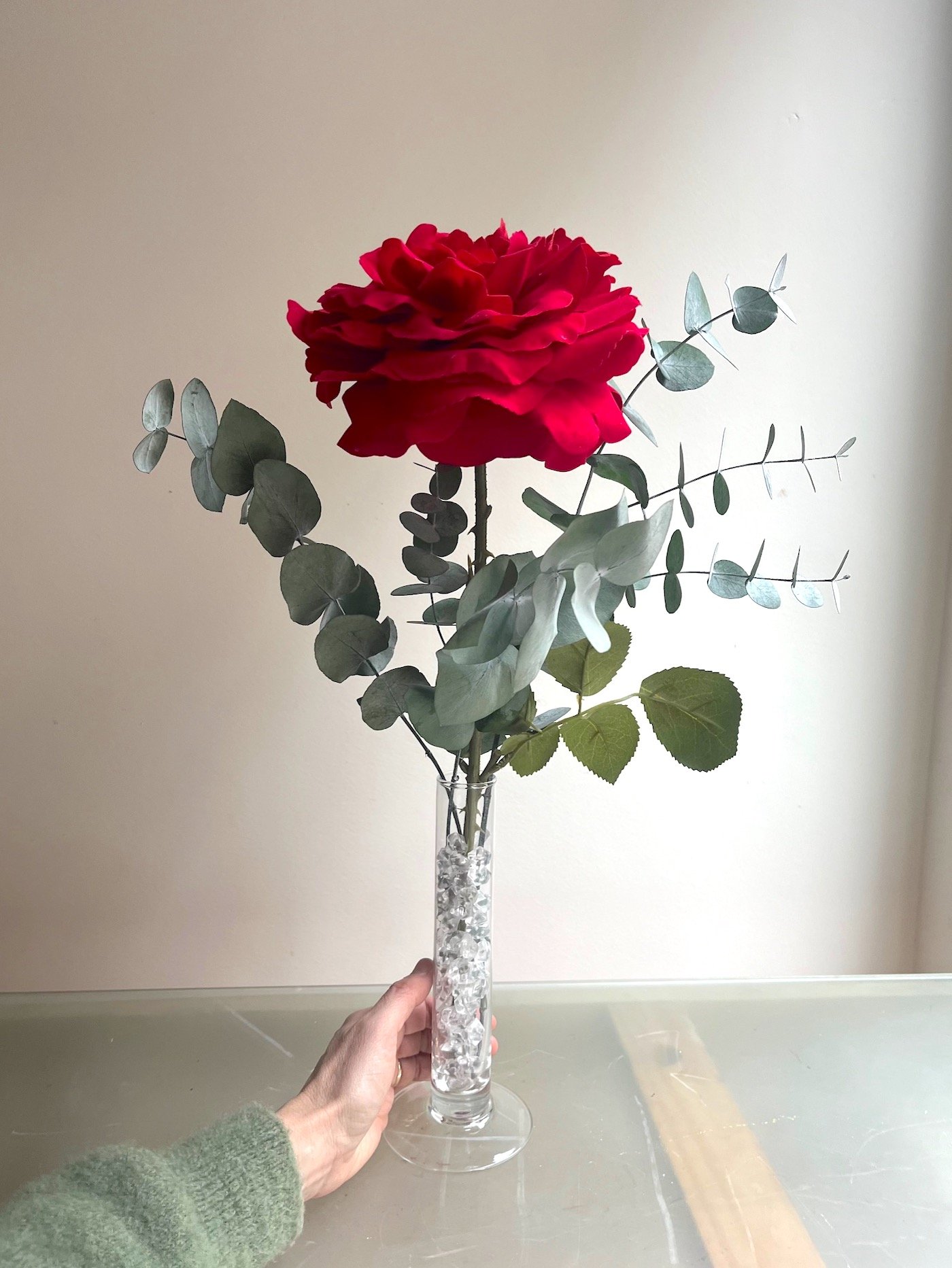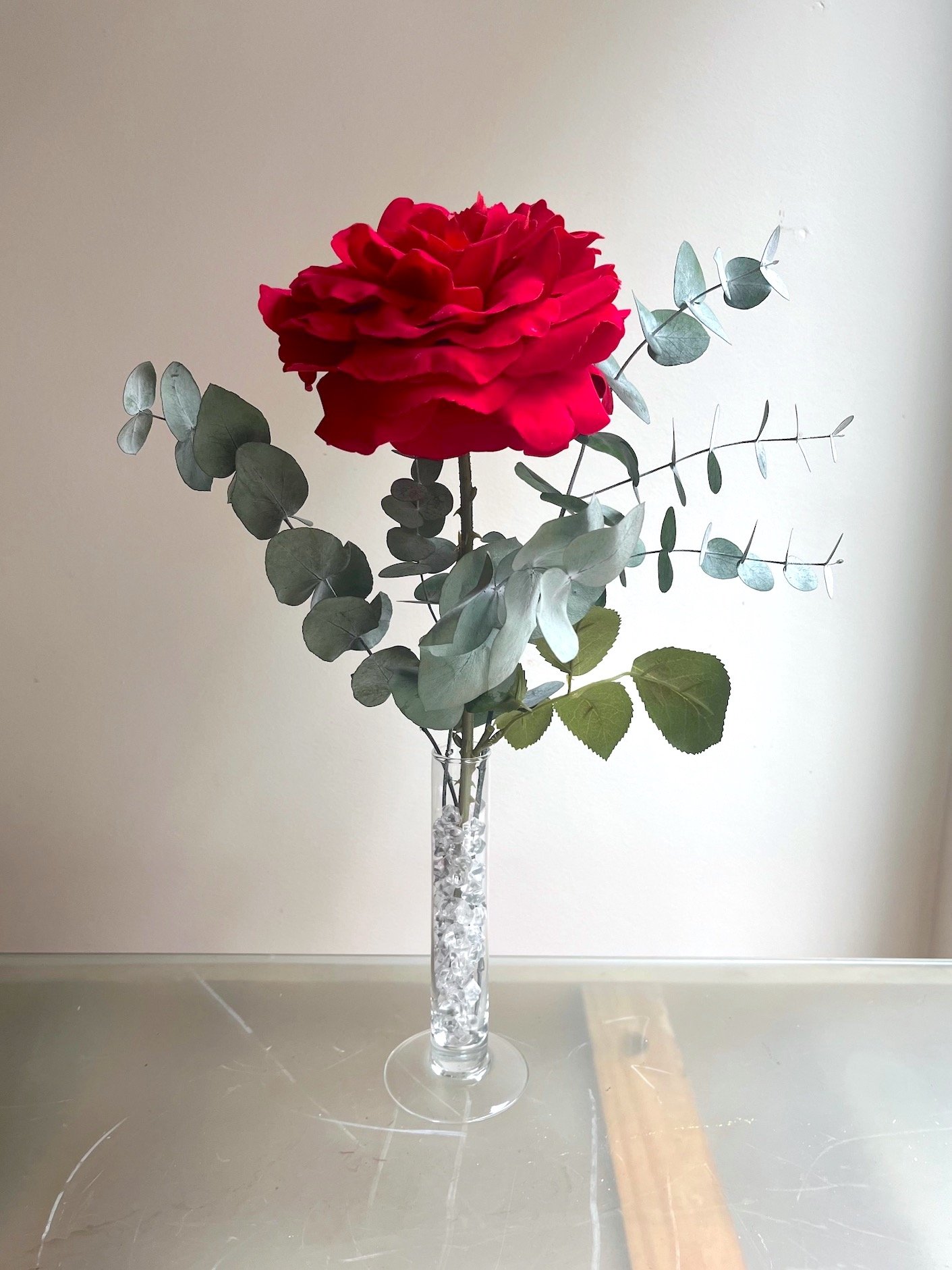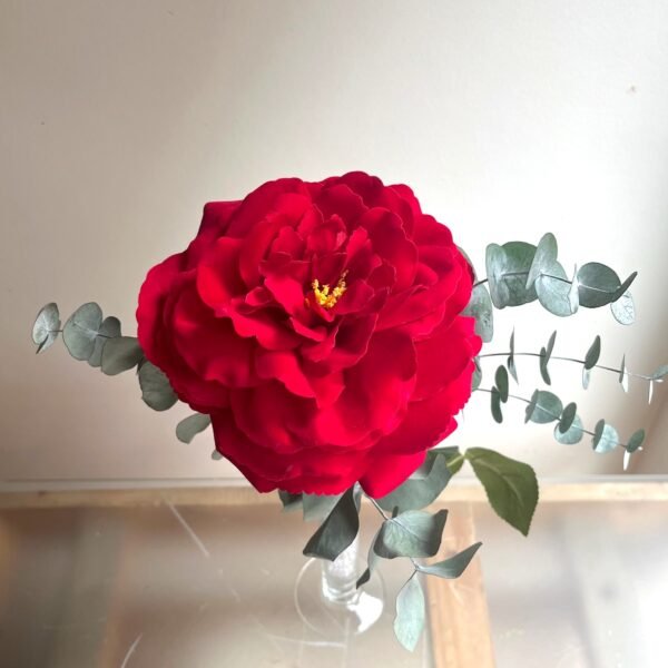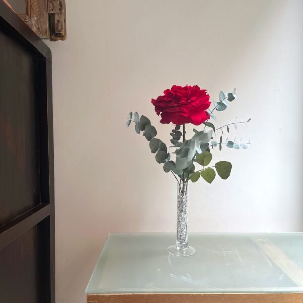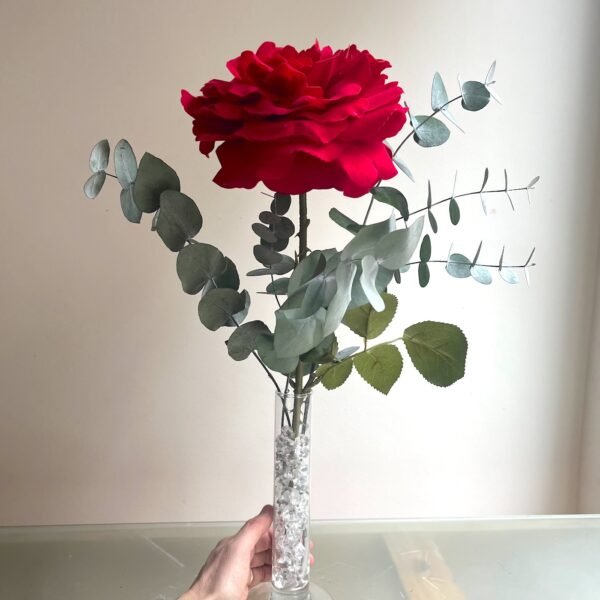 Una sola Rosa roja grande de tela con eucalipto preservado en violetero de cristal.