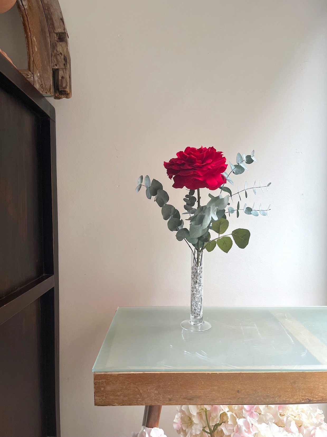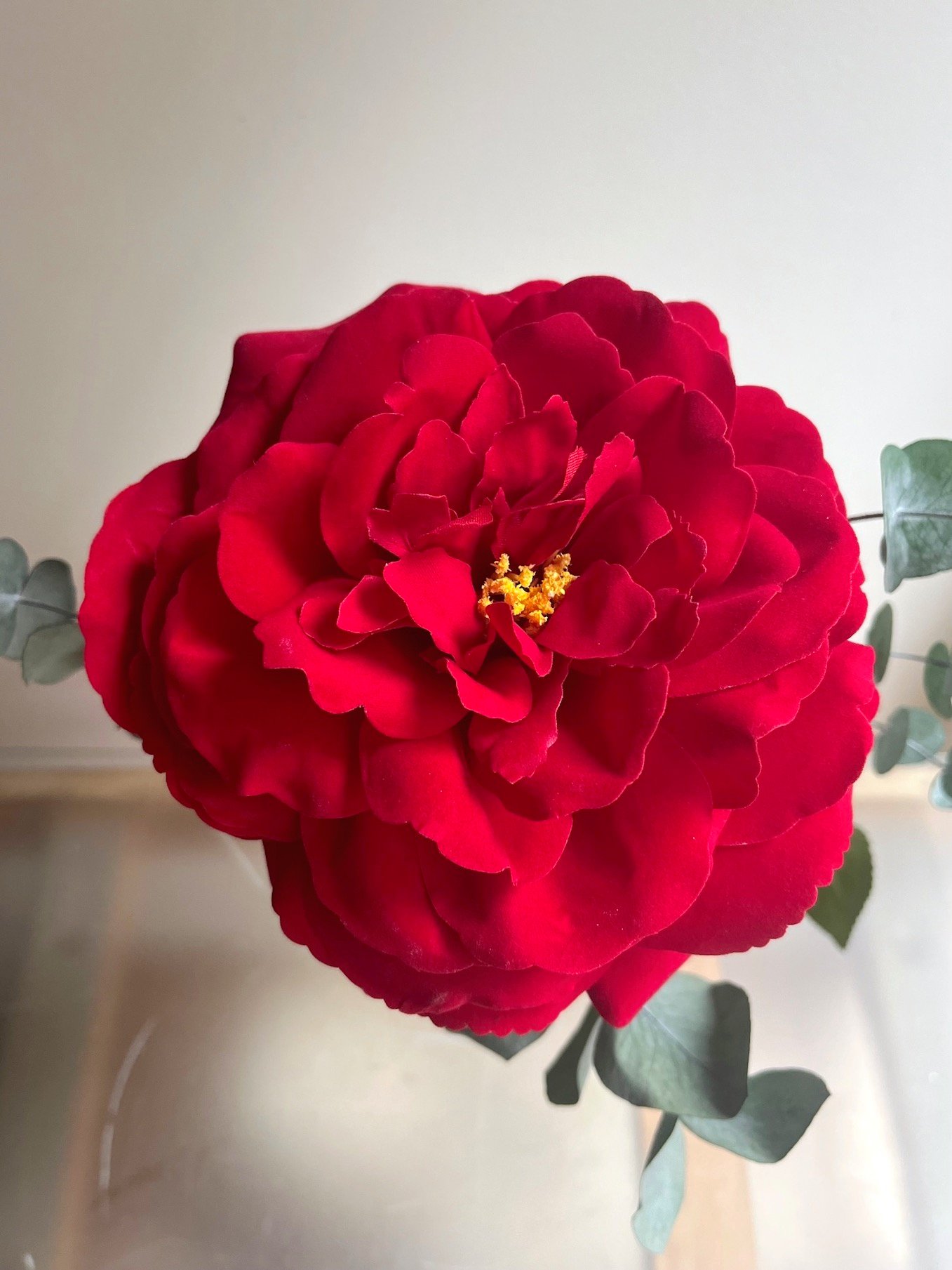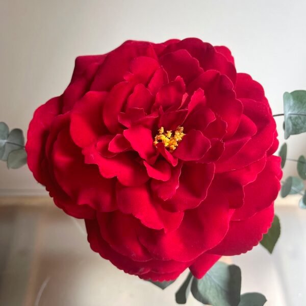 Una sola Rosa roja grande de tela con eucalipto preservado en violetero de cristal.
