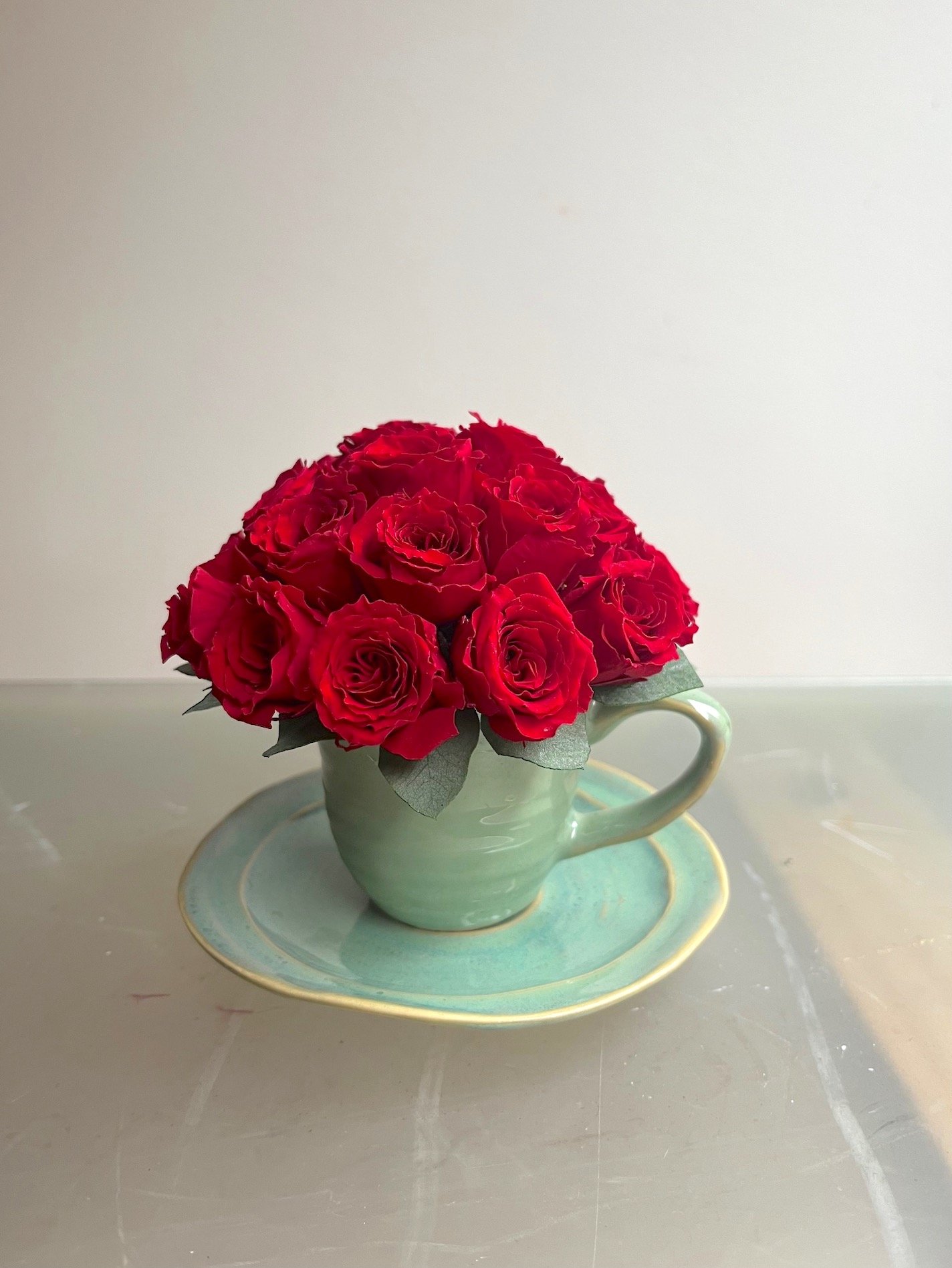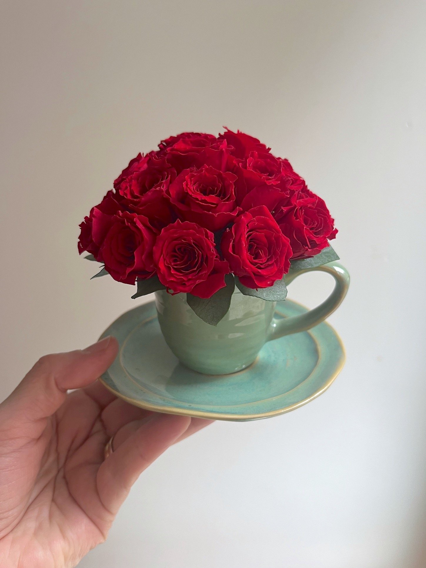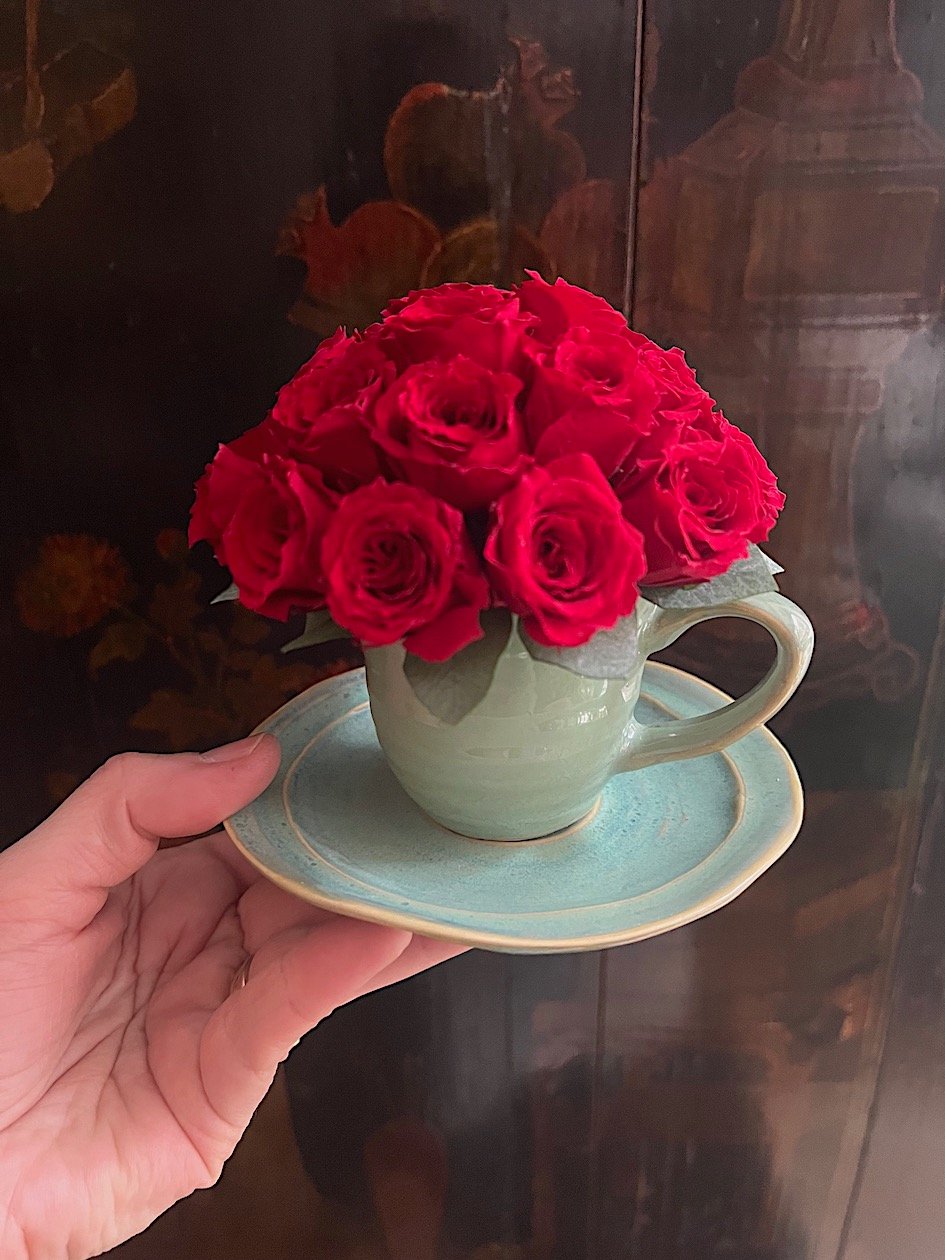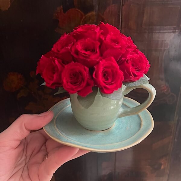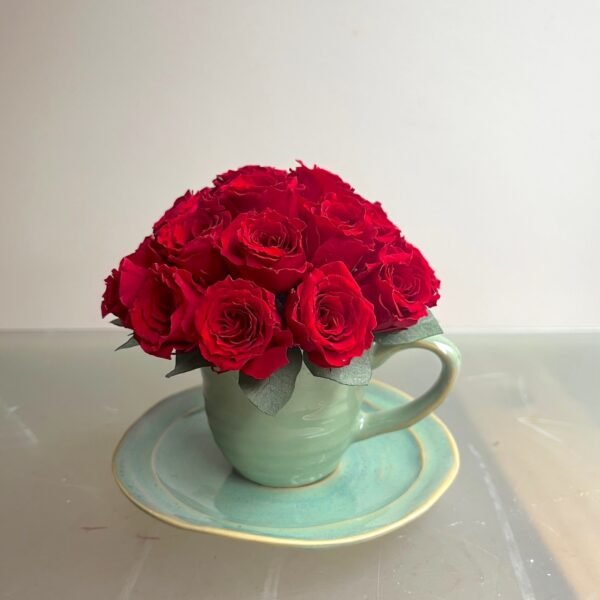 Preciosa tacita cerámica cuajada de Rosas de pitiminí rojas preservadas.