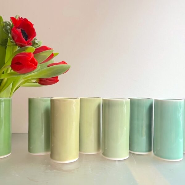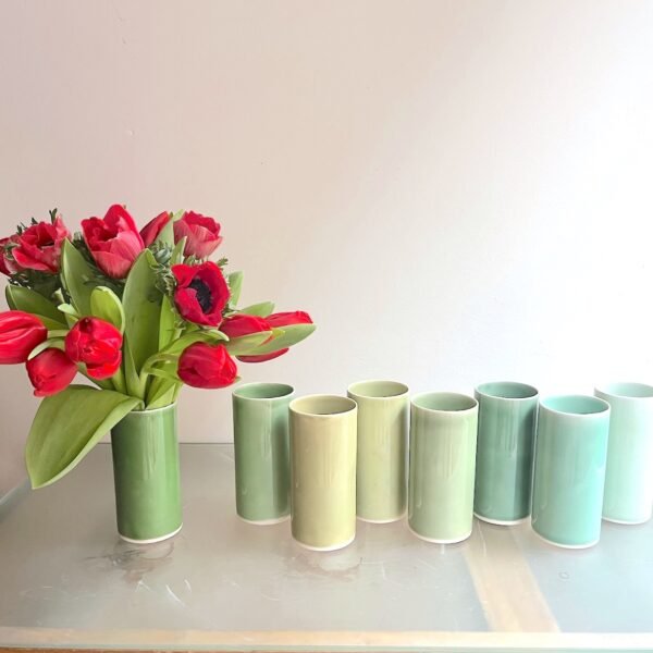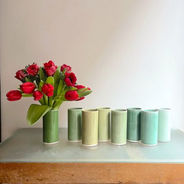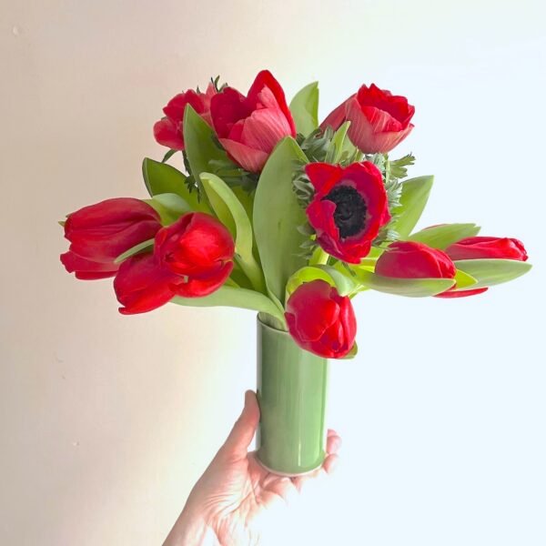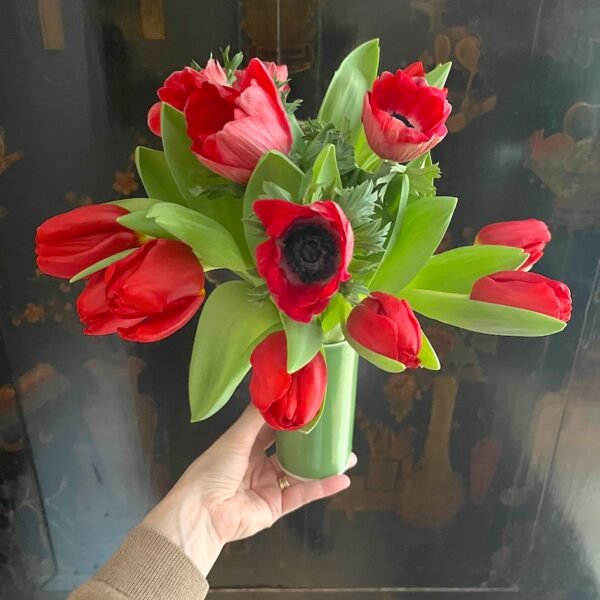 Fresco arreglo de flores de temporada sobre cilindro de porcelana, de Fernando Alcalde hecho a mano en España. El número de flores es alrededor de 15, dependerá del tamaño de las mismas, utilizando las que sean necesarias para que el bouquet sea completo y redondo.